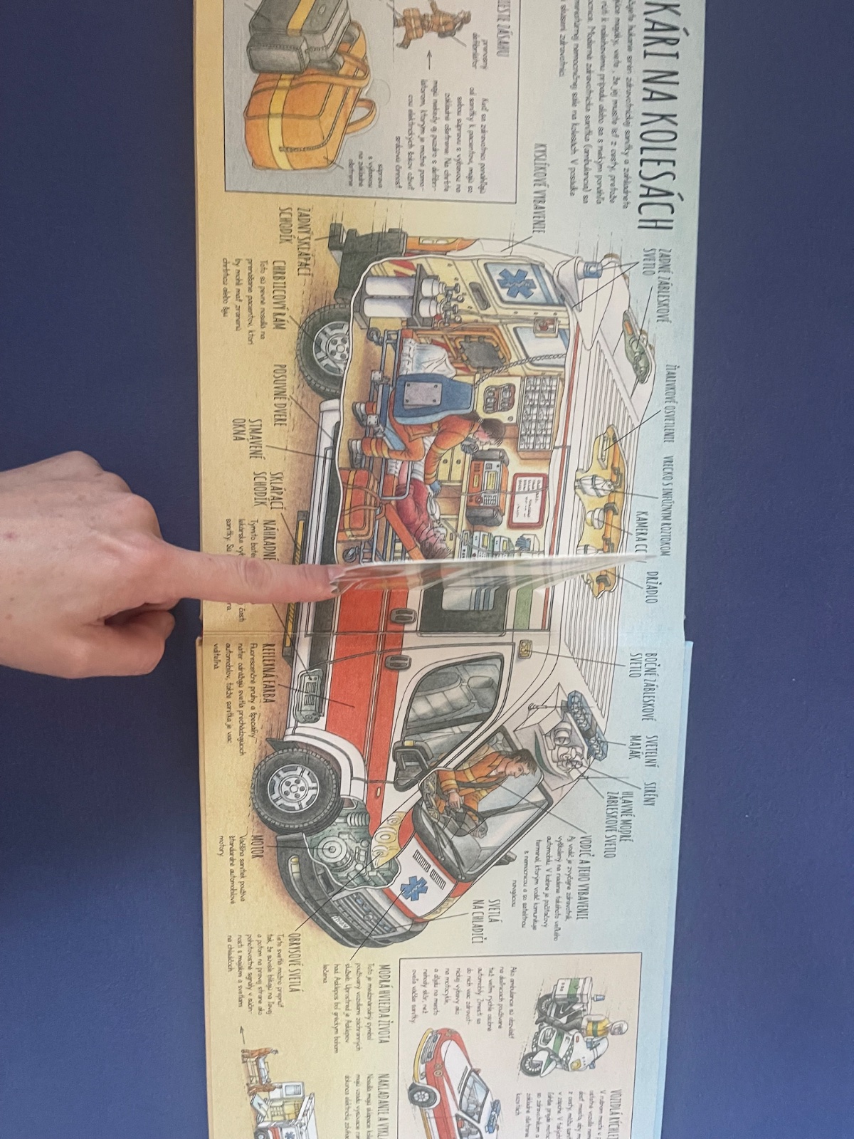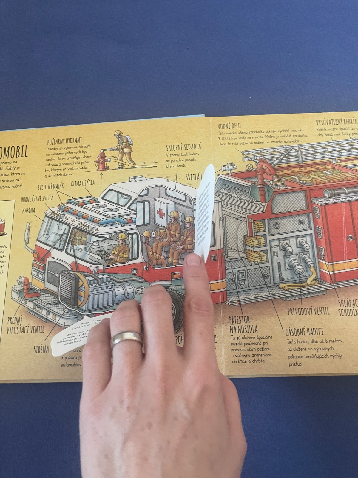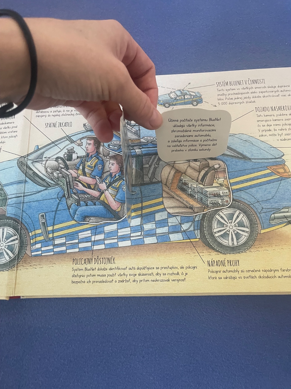 Kniha je vo veľmi peknom stave. Na každej strane je nejaký stroj, okienka sa otvárajú a v nich sú ďalšie informácie