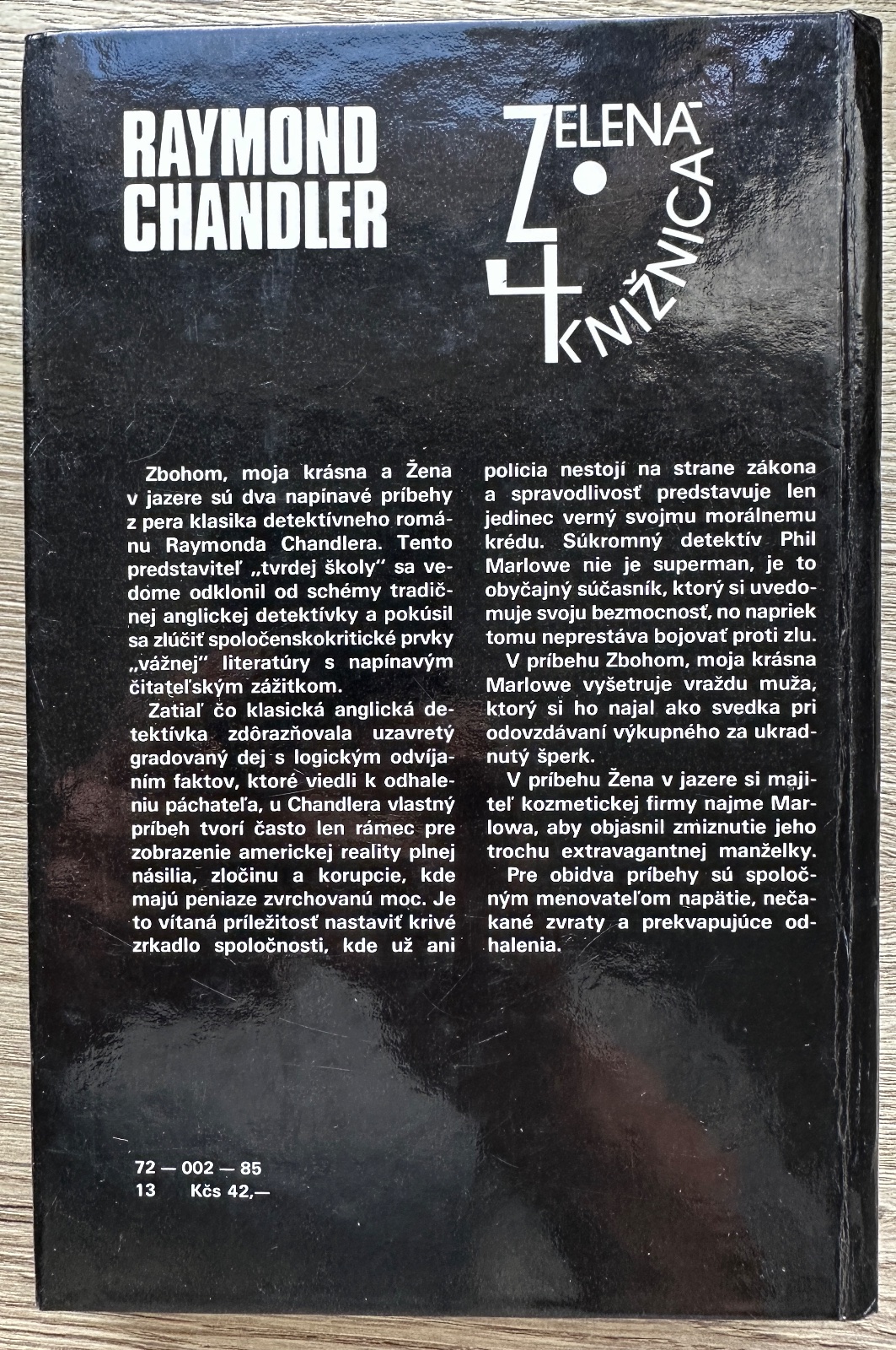 ☘️❤️Kniha citana ale stav ako nova, bez vad a chyb, mozete dat niekomu aj ako darcek.1.Skeptik a samotář Phil Marlowe přichází ke svým případům neočekávaně.Náhoda ho vtáhne do pátrání po krásné Velmě,bývalé tanečnici v nočním klubu. 2. Marlowa si najme majitel kosmetické firmy,aby objasnil zmizení jeho manželky.Vydal: Slovenský spisovateľ, Bratislava, stran:446☘️❤️