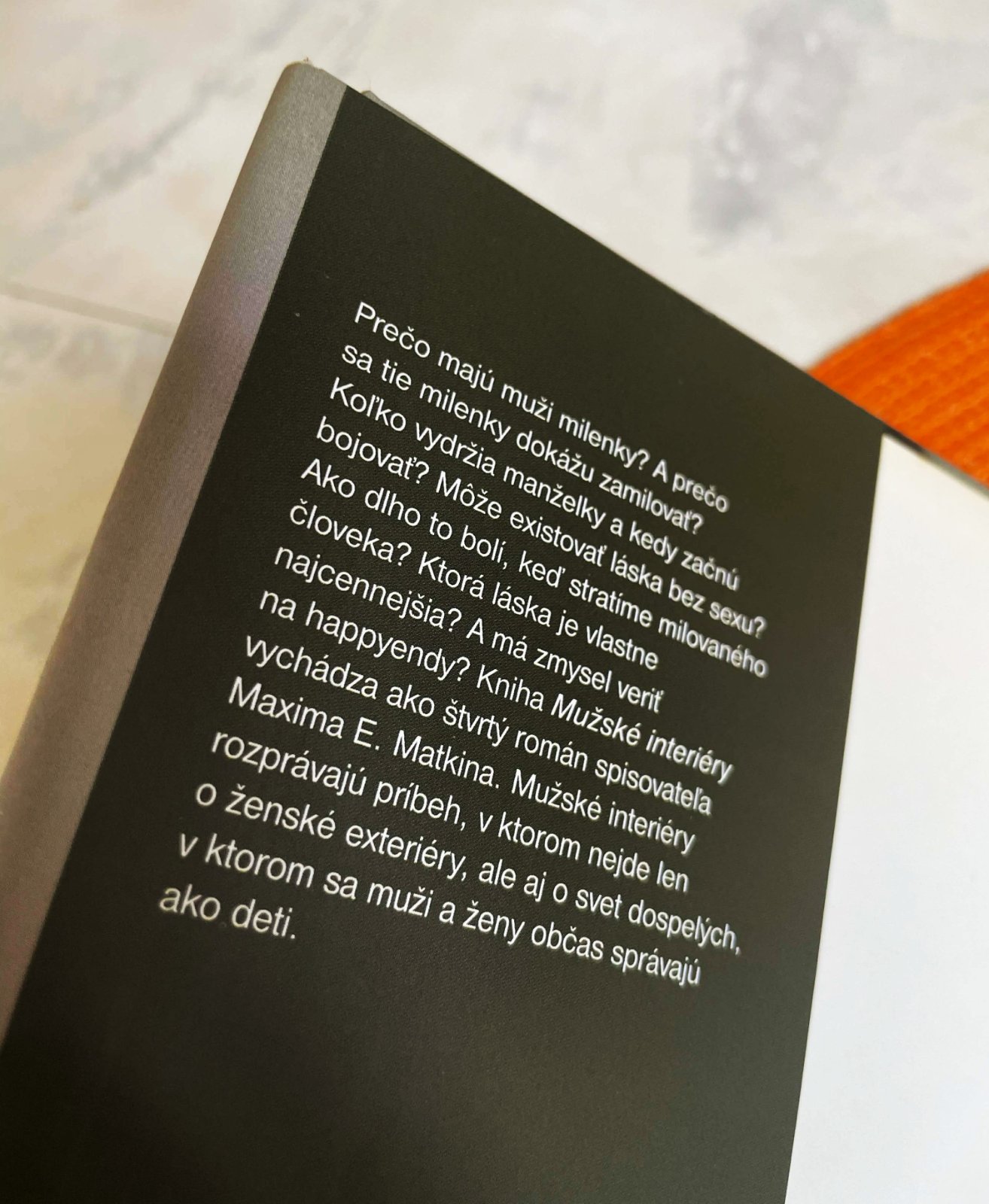 Kniha Mužské Interiéry vyjde knižne ako v poradí štvrtý román spisovateľa Maxima E. Matkina. Mužské interiéry rozprávajú príbeh, v ktorom nejde len o ženské exteriéry, ale aj o svet dospelých, v ktorom sa muži a ženy občas správajú ako deti.