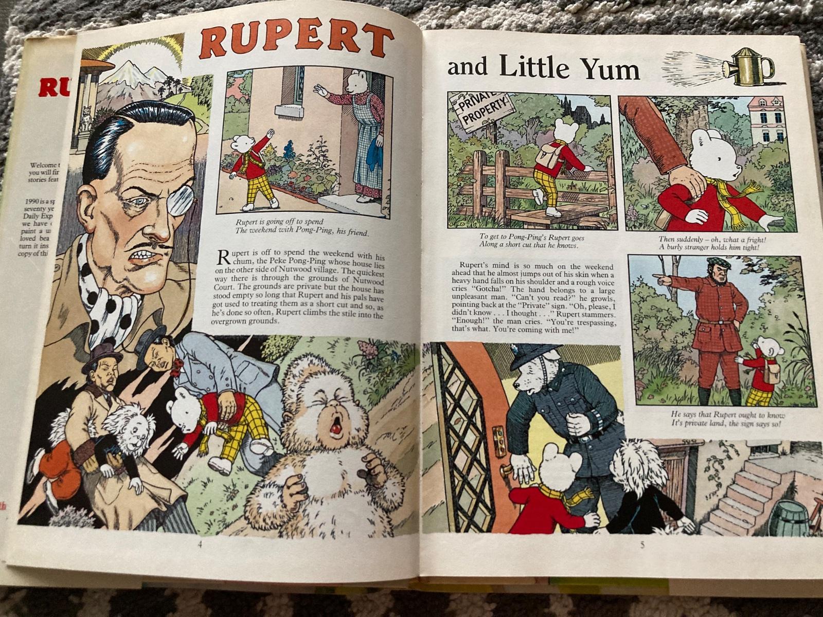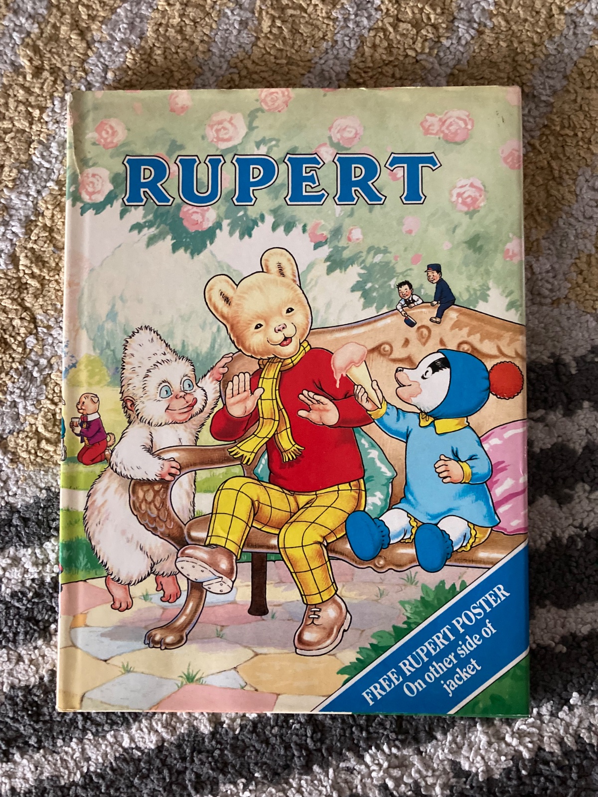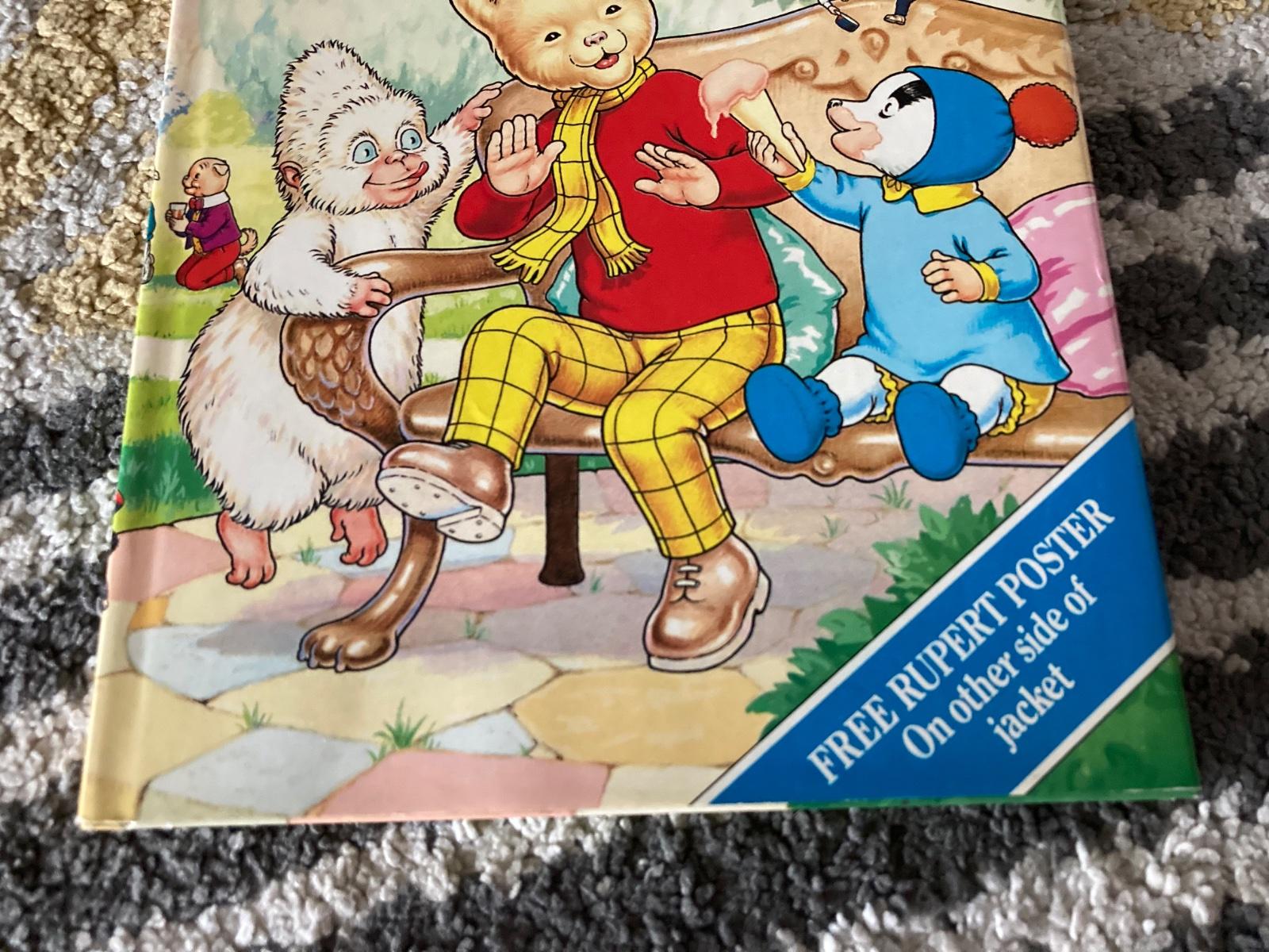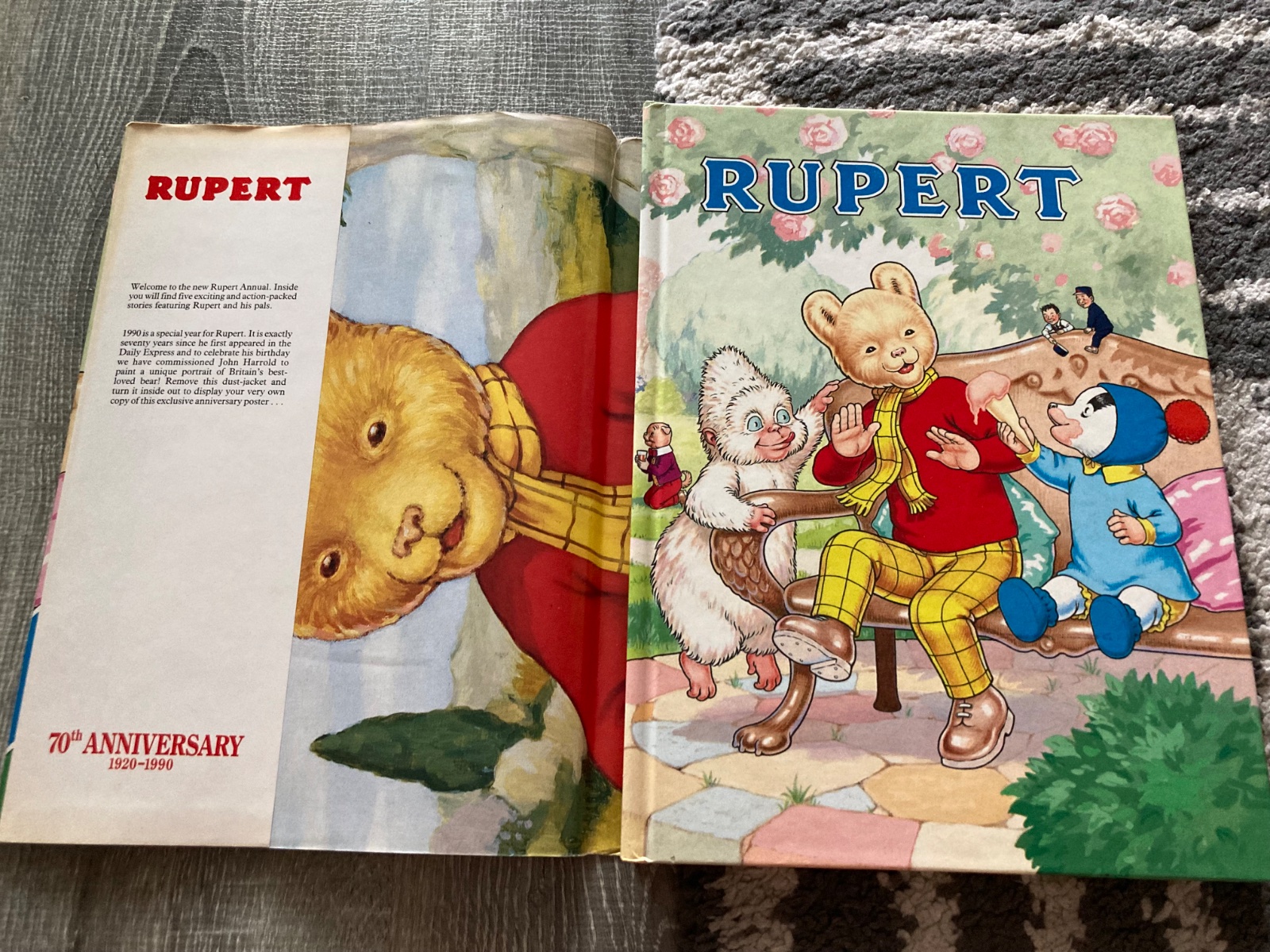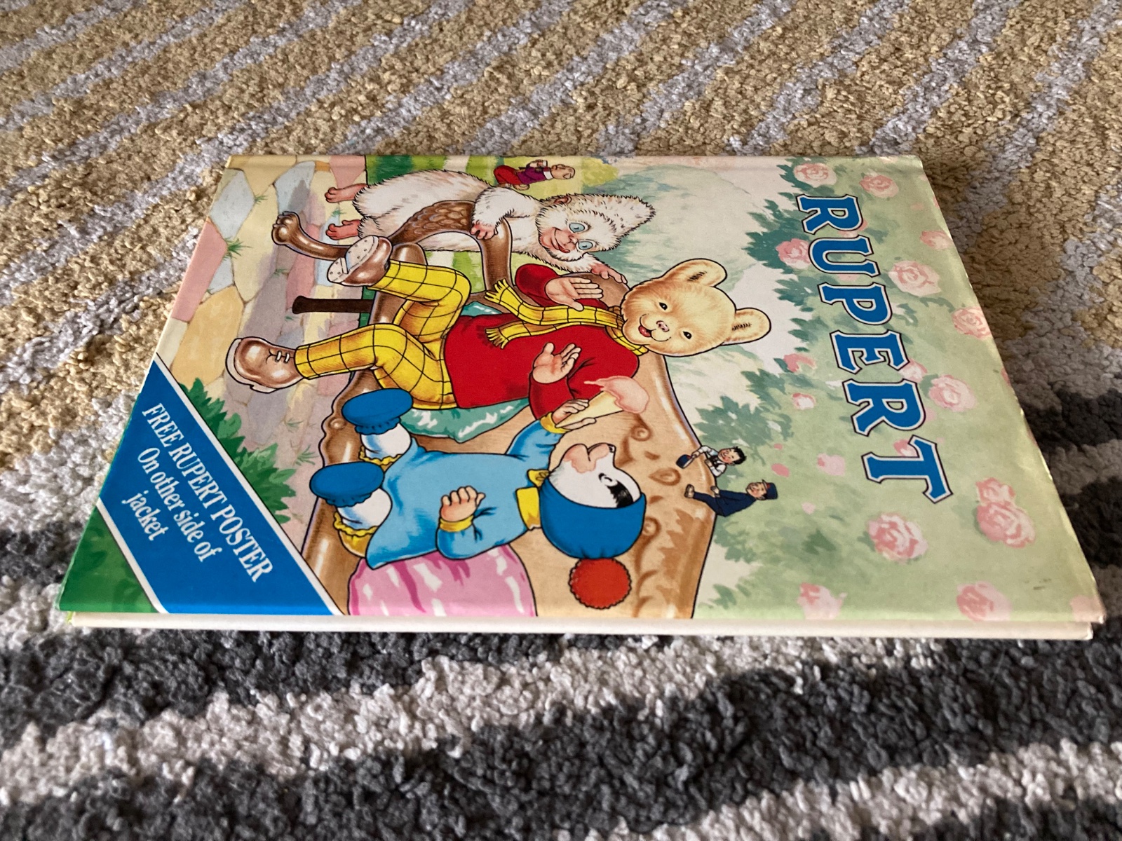 📌Vintage Rupert the bear 1990 anniversary 70 th year 1920-90 Daily Express annual , Free Rupert poster ( by John Harrold ) included on the back of the dustjack . full of colour comic strip adventures with all his friends all nine chapters.open day at the squires , Rupert and little yum, Rupert and the sea queen, Rupert and the eastern isle , fantastic book .