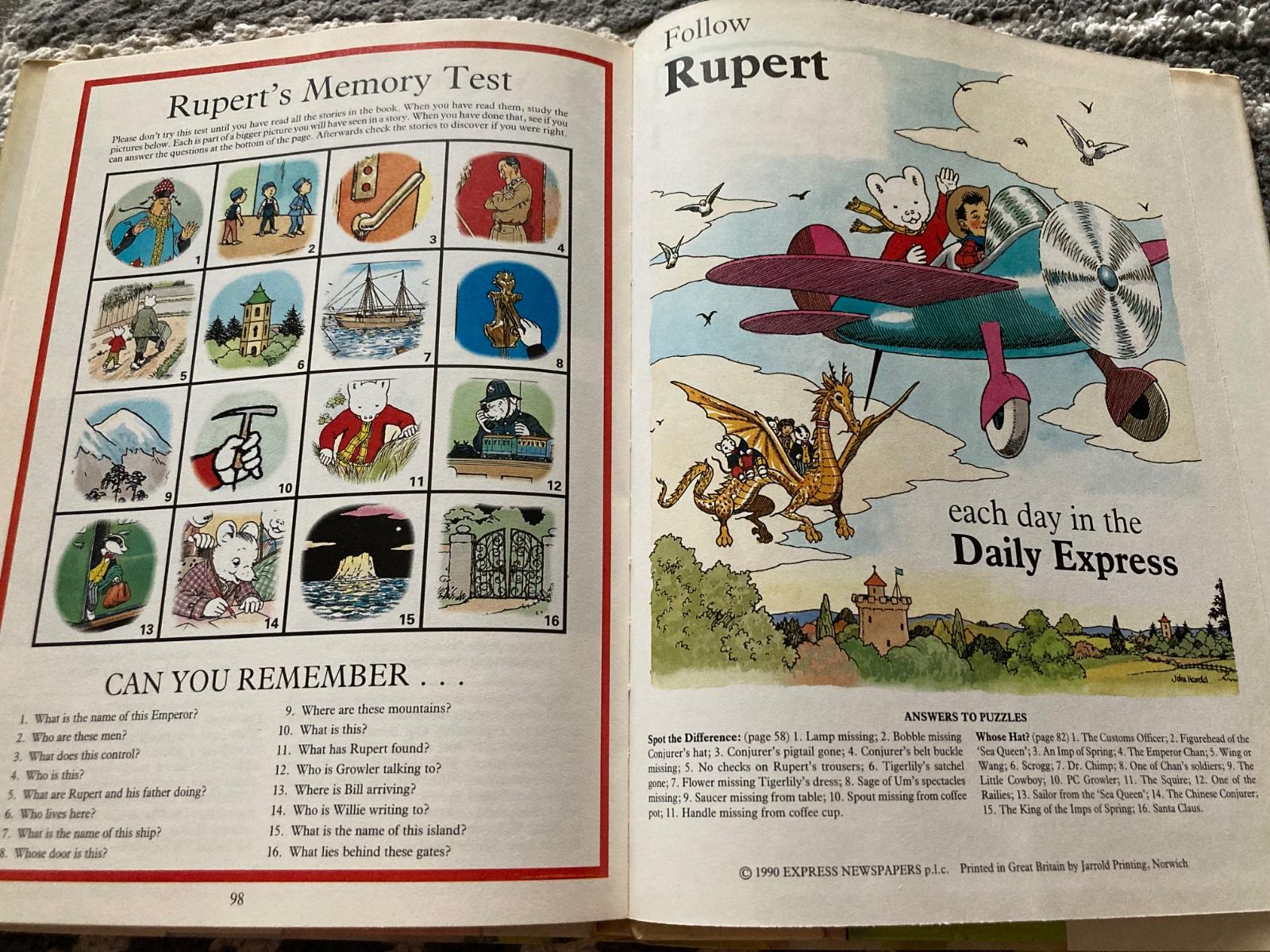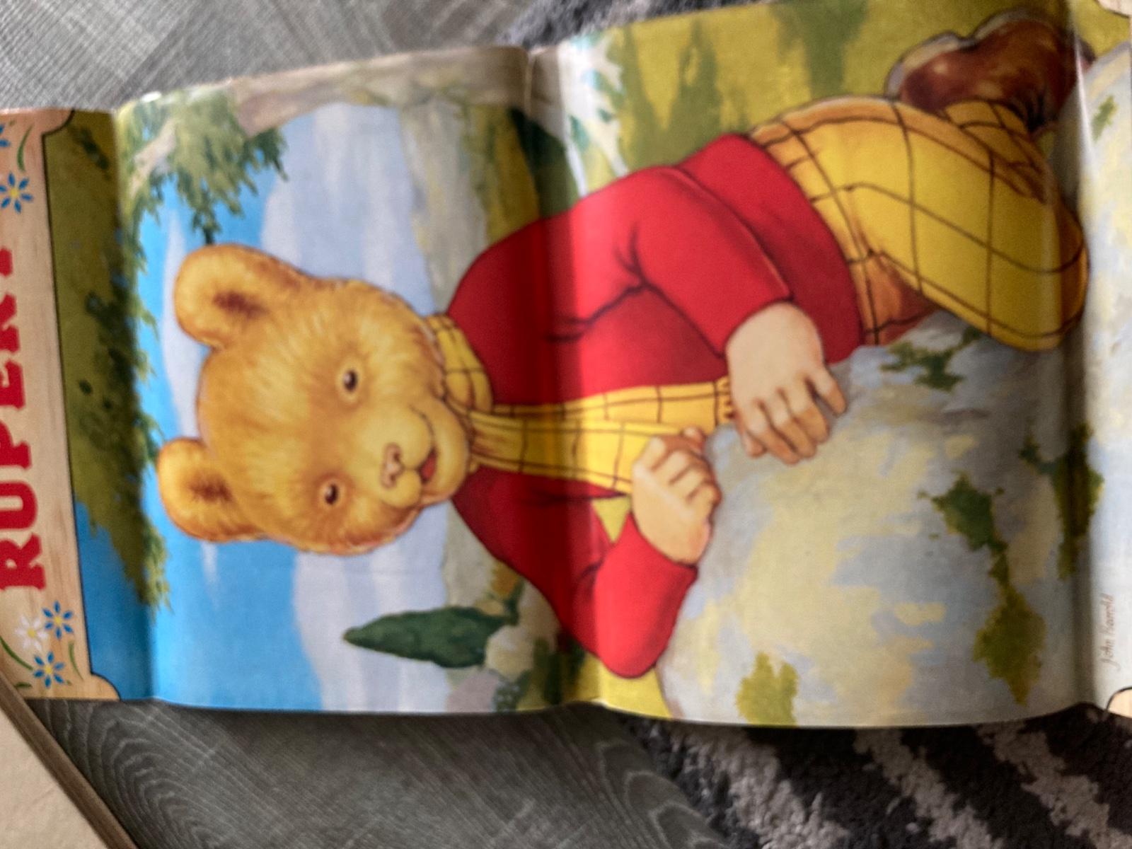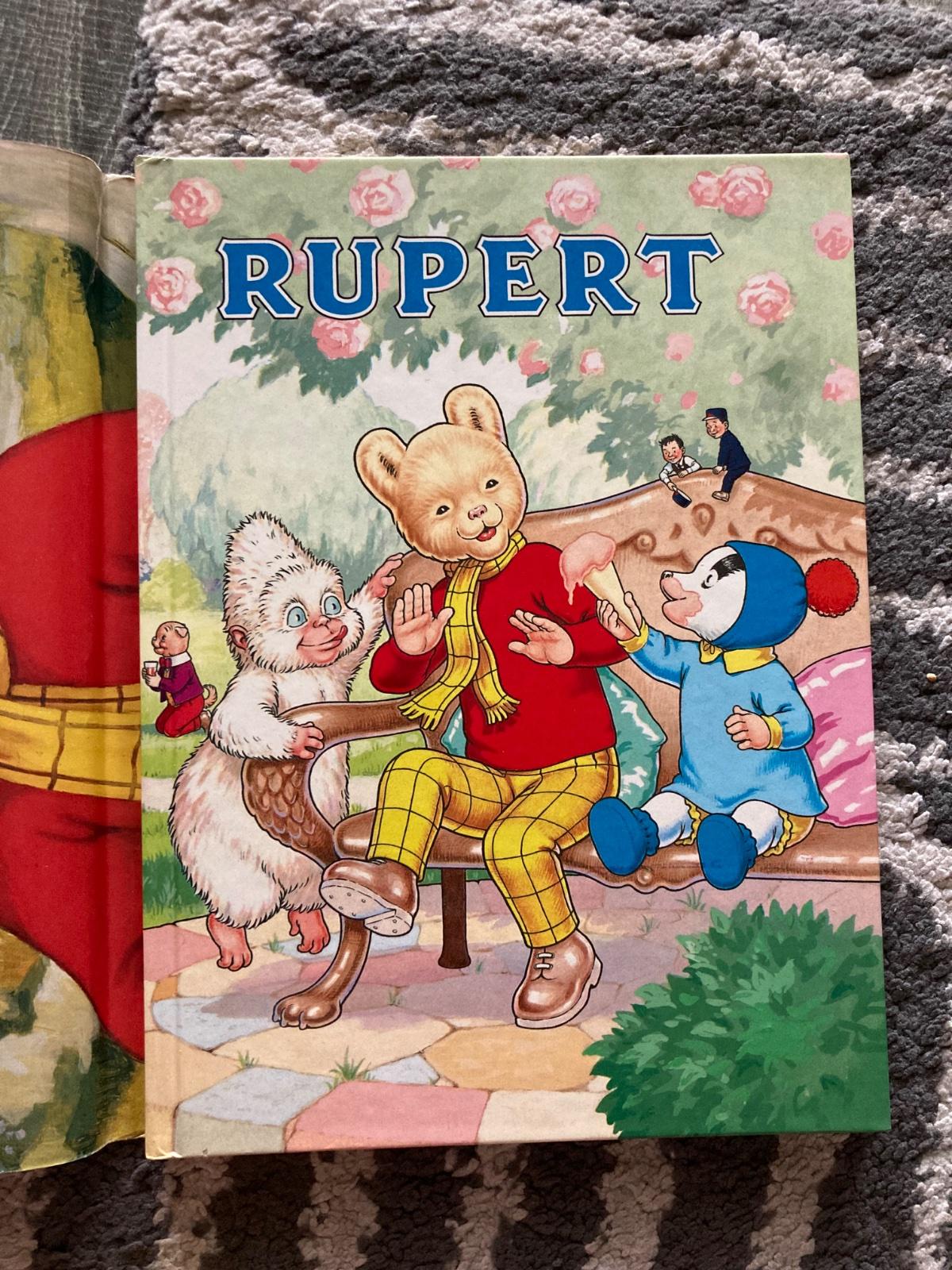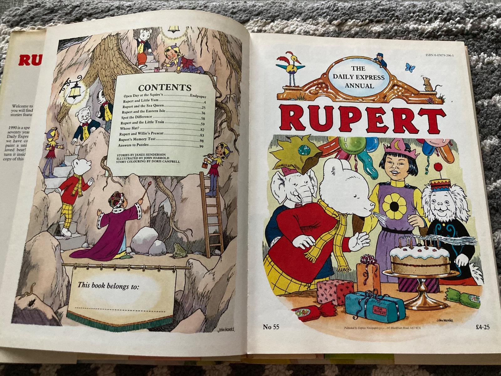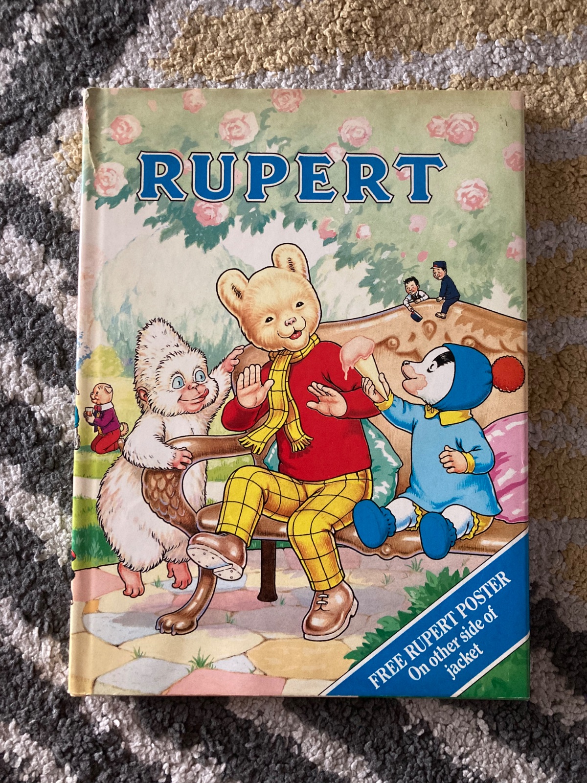 📌Vintage Rupert the bear 1990 anniversary 70 th year 1920-90 Daily Express annual , Free Rupert poster ( by John Harrold ) included on the back of the dustjack . full of colour comic strip adventures with all his friends all nine chapters.open day at the squires , Rupert and little yum, Rupert and the sea queen, Rupert and the eastern isle , fantastic book .