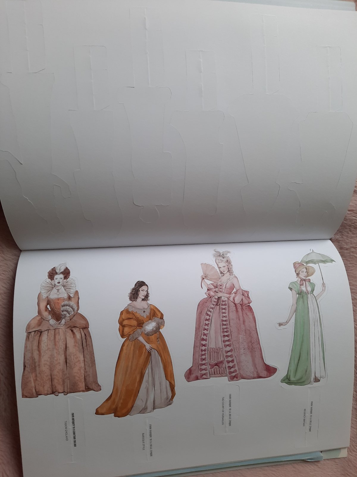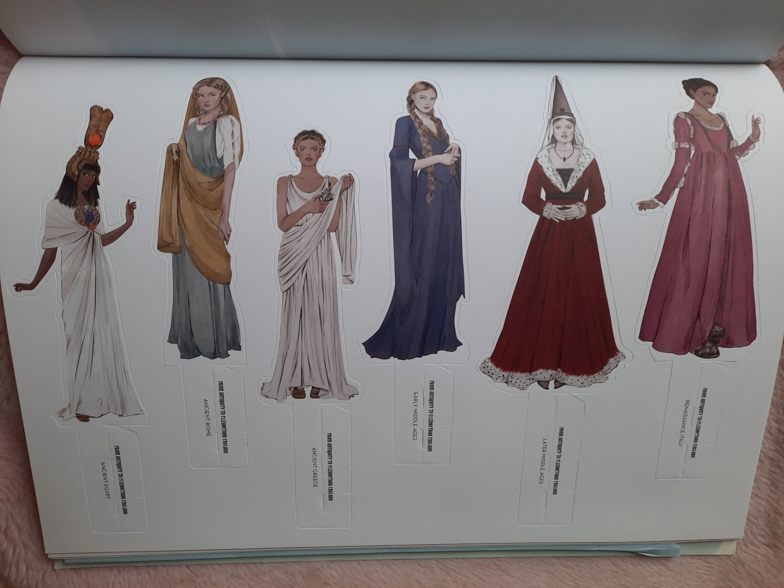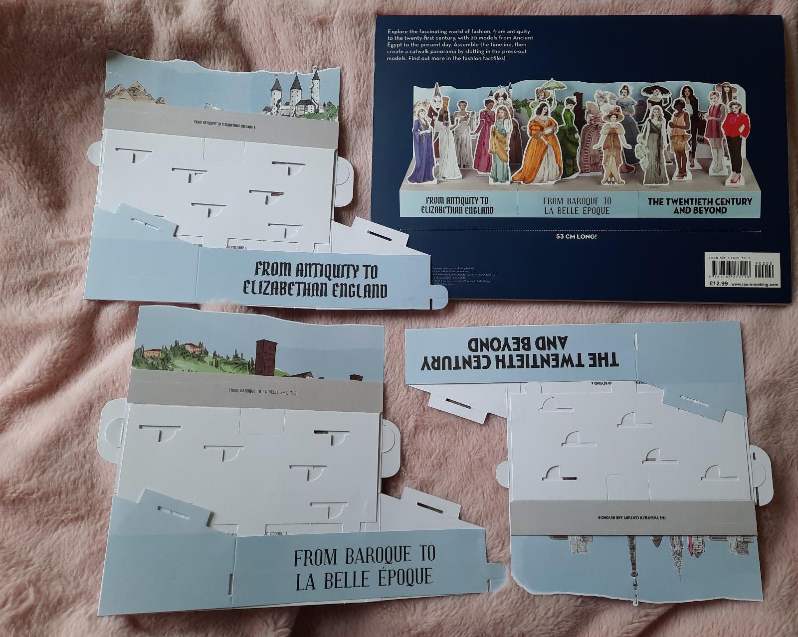Na každom liste je zobrazená dobová móda daného obdobia so zaujímavosťami a faktami. Na záver v knižke sú všetky modely zobrazené osobitne - dajú sa z knižky vybrať a vložiť do stojana, ktorý je tiež súčasťou knižky.