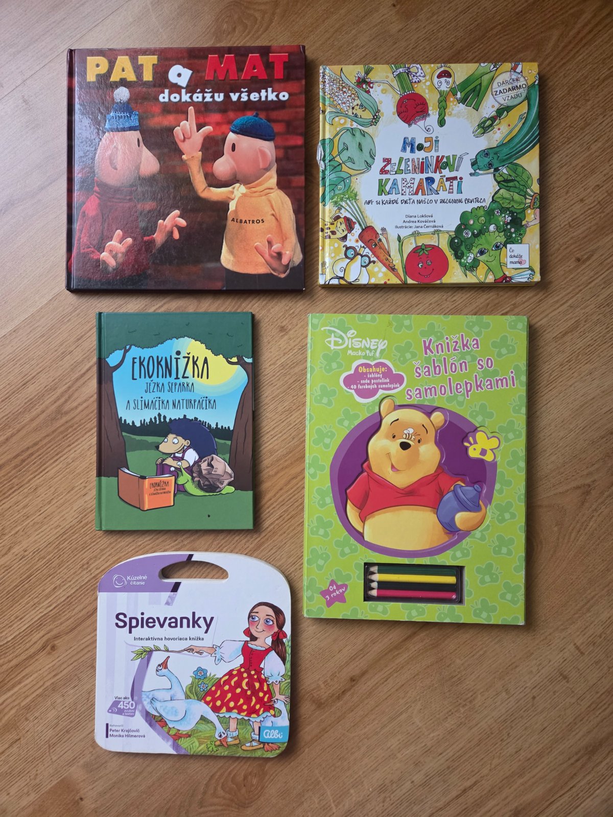 Ponúkam detské knižky - Spievanky, Disney Knižka šablón so samolepkami, Ekoknižka Ježka Separka a slimáčika Naturáčika, Pat a Mat dokážu všetko, Spievanky. Pekný stav. Predaj len spolu 3,00€ + pošta