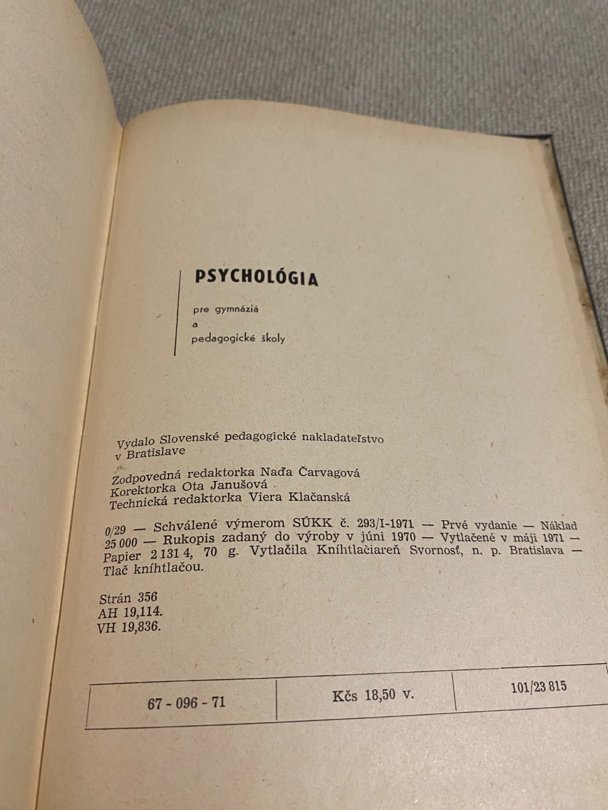 0/29 Schválené výmerom SÚKK č. 293/1-1971 25 000 Rukopis zadaný do výroby v júni 1970 Prvé vydanie Náklad Vytlačené v máji 1971 - Papier 21314, 70 g. Vytlačila Kníhtlačiareň Svornosť, n. p. Bratislava Tlač kníhtlačou.