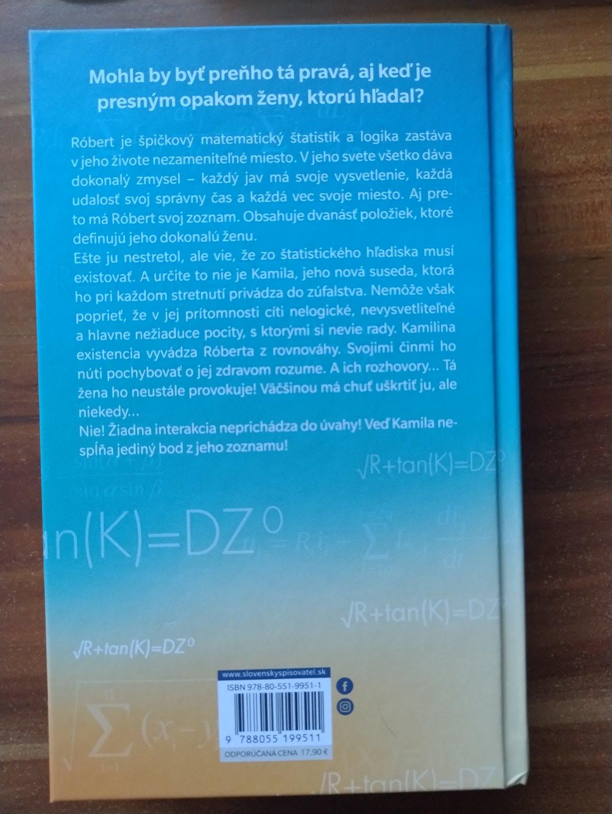 Róbert je špičkový matematický štatistik a logika zastáva v jeho živote nezameniteľné miesto. V jeho svete všetko dáva dokonalý zmysel – každý jav má svoje vysvetlenie, každá udalosť svoj správny čas a každá vec svoje miesto. Aj preto má Róbert svoj zoznam. Obsahuje dvanásť položiek, ktoré definujú jeho dokonalú ženu. Ešte ju nestretol, ale vie, že zo štatistického hľadiska musí existovať. A určite to nie je Kamila, jeho nová suseda, ktorá ho pri každom stretnutí privádza do zúfalstva. Nemôže však poprieť, že v jej prítomnosti cíti nelogické, nevysvetliteľné a hlavne nežiaduce pocity, s ktorými si nevie rady.