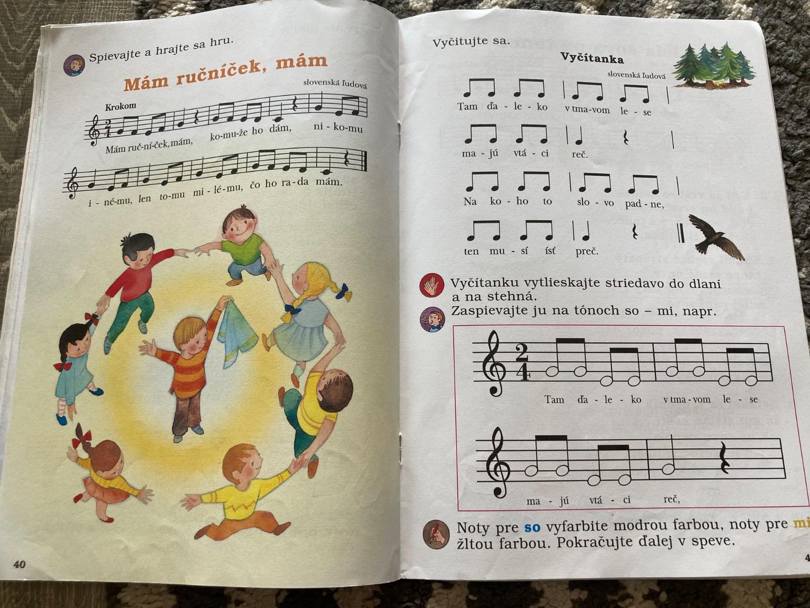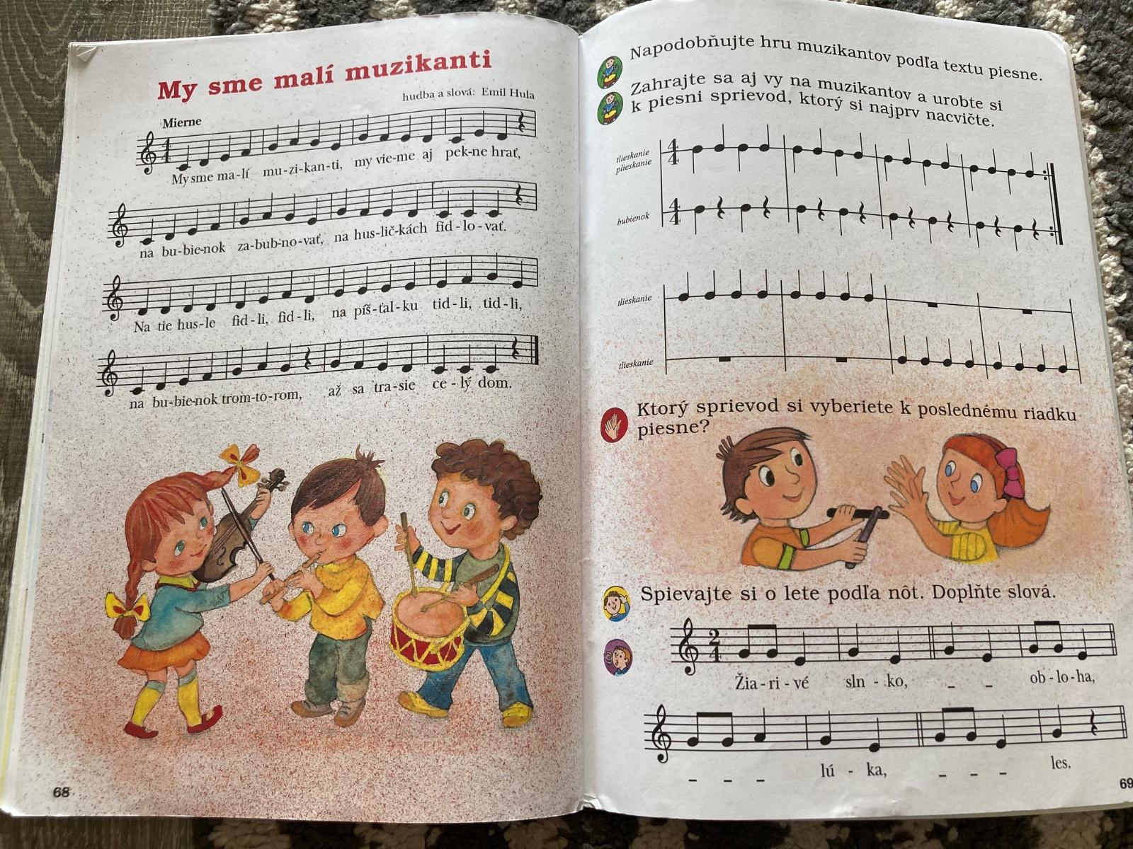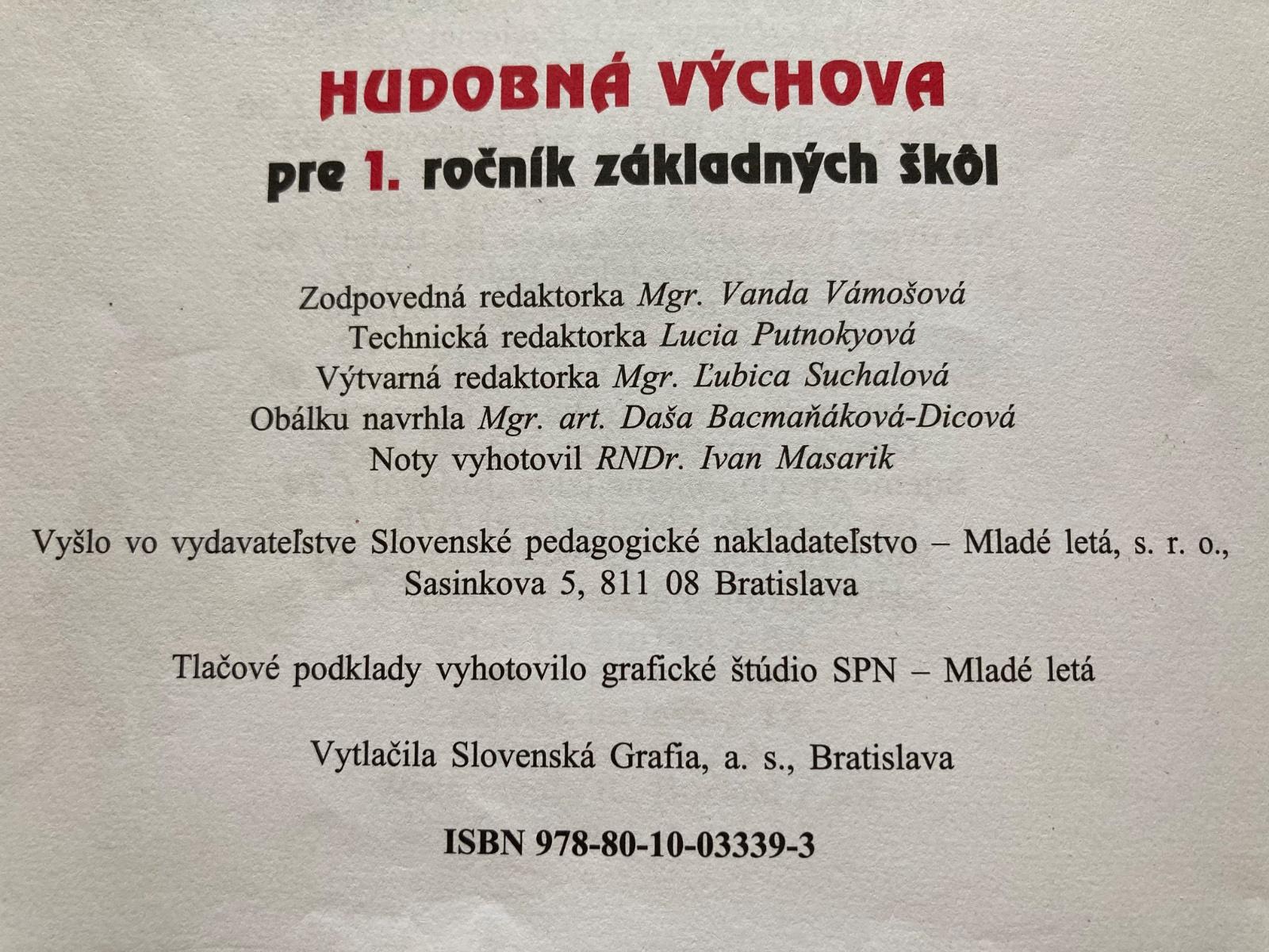 📌Hudobná výchova pre 1.ročník ZŠ je pre prváčikov tým pravým sprievodcom do sveta hudby. Nájdete v nej slovenské ľudové piesne, známe vyčítanky, riekanky, hudobné hádanky a koledy a to všetko v sprievode zvučných mien zo sveta hudby a literatúry (E. Suchoň, P.I. Čajkovskij, J. Matuška, B. Felix, D. Hevier, Ľ. Podjavorinská, J. Pavlovič...)