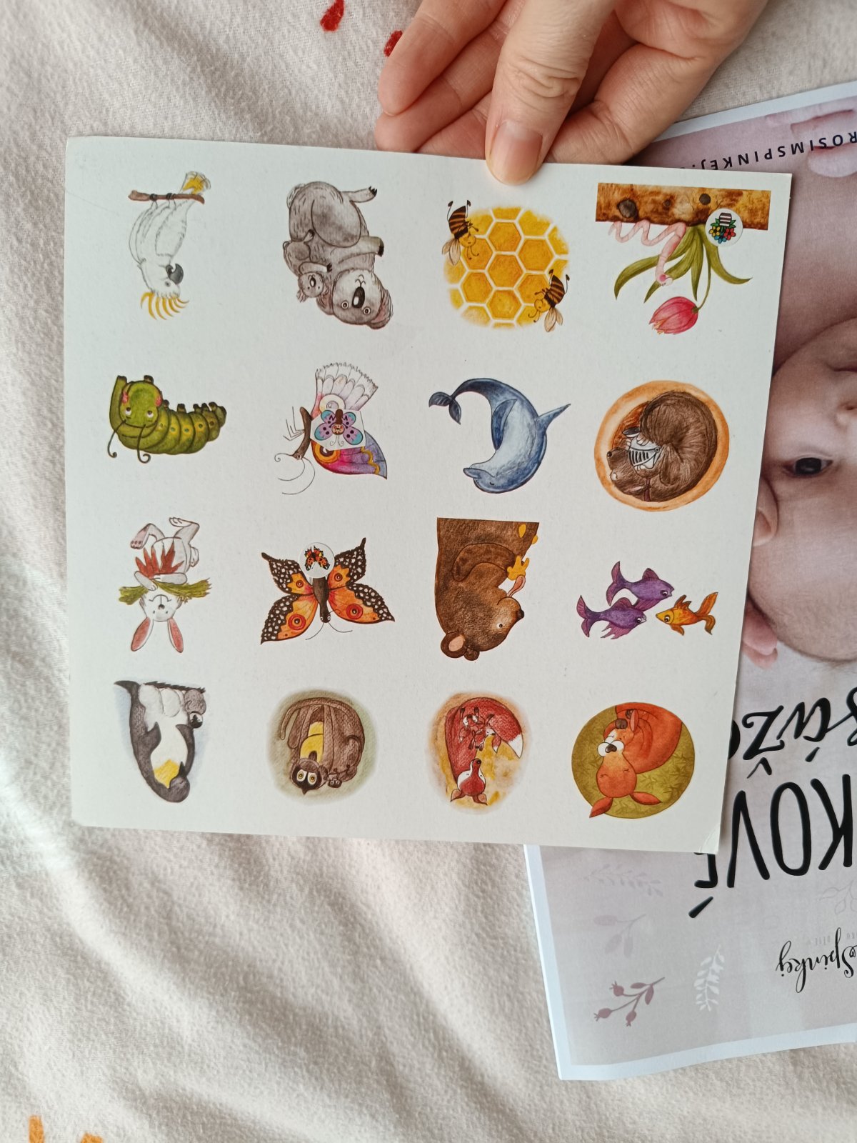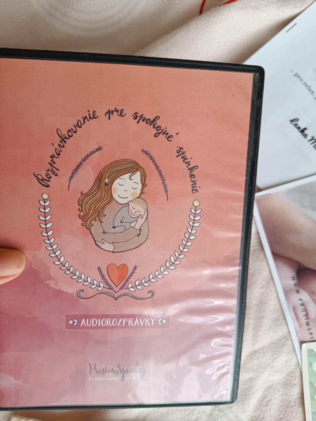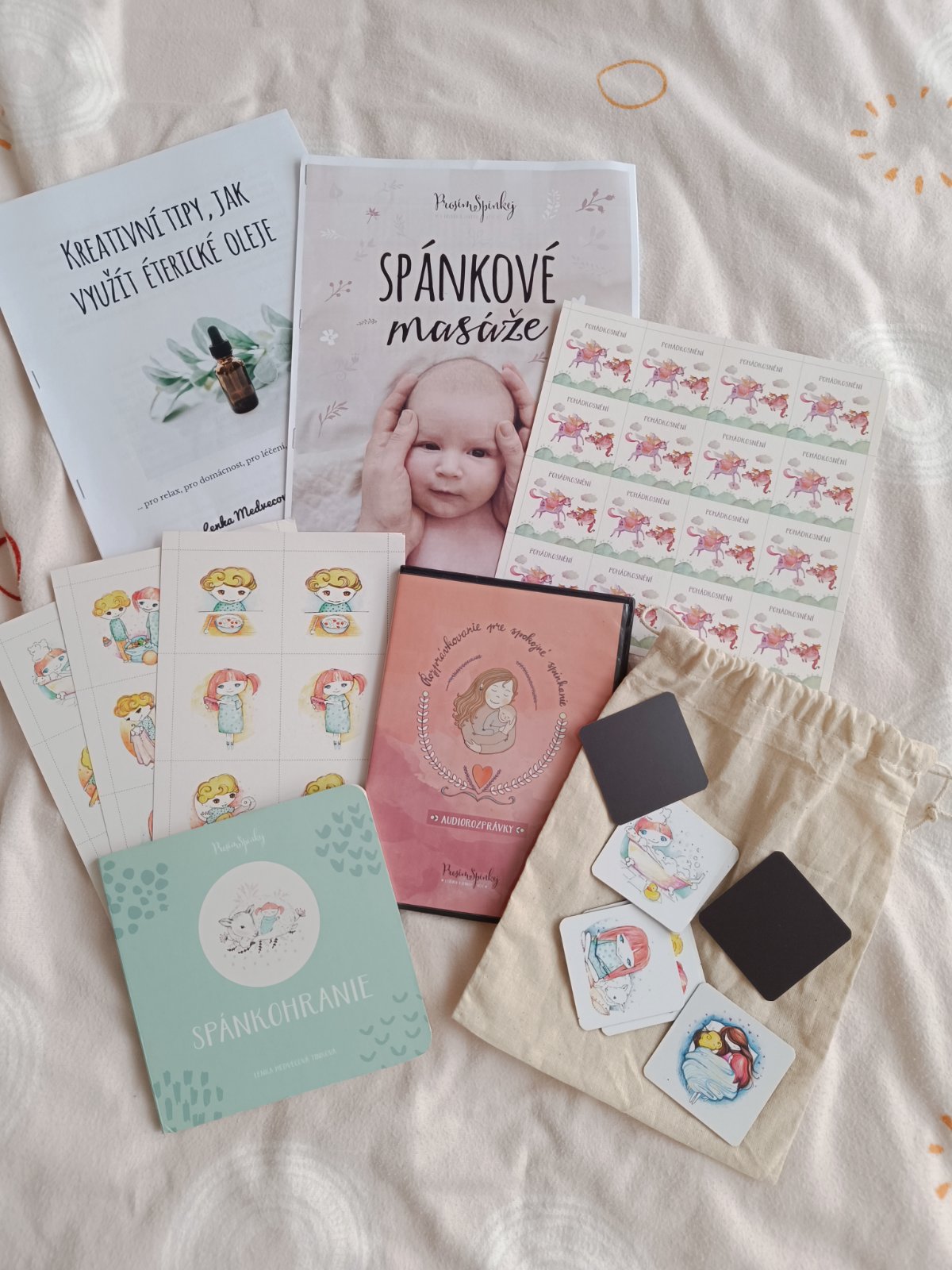 Spankohranie leporelo, CD s audio rozprávkami v slovenskom jazyku, magnetky - ktoré sú už nepredajné na stránke, plátená tastička pexeso, vytlačené bonusy- masáže pre bábätká a a aromaterapia, všetko tak ako je na foto.