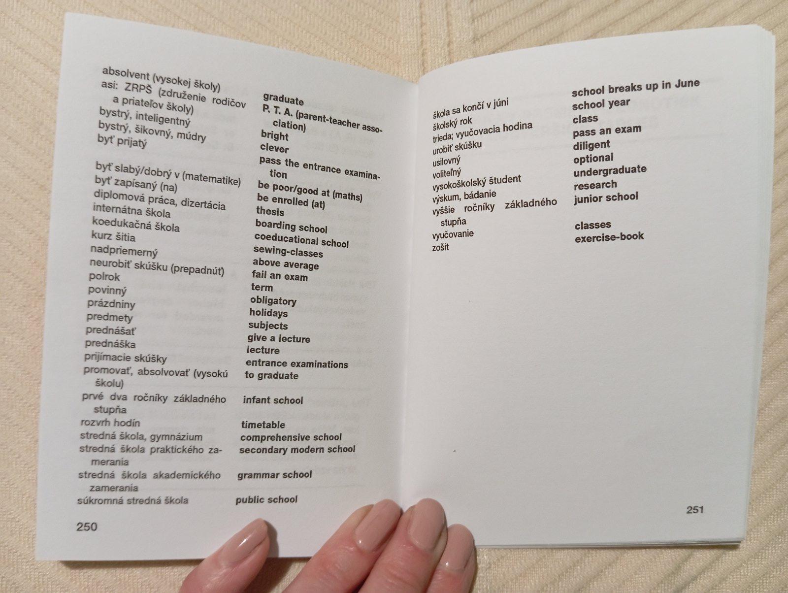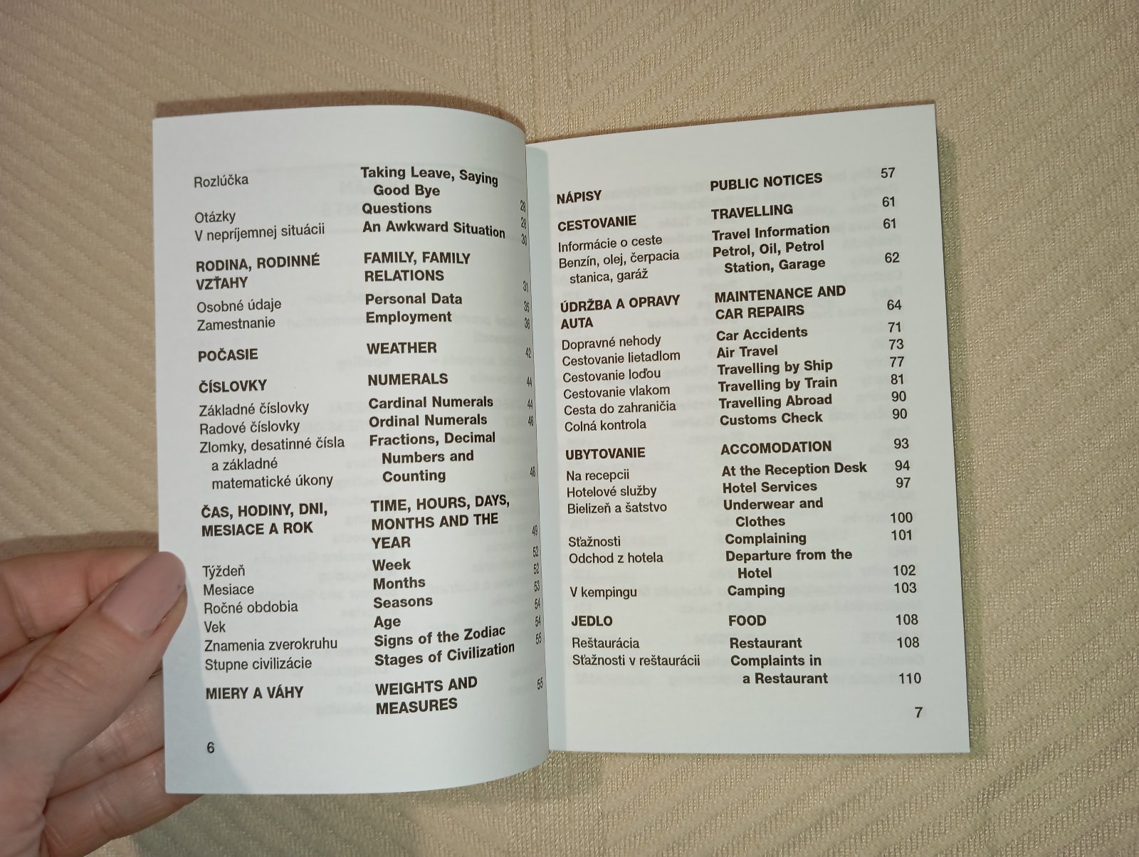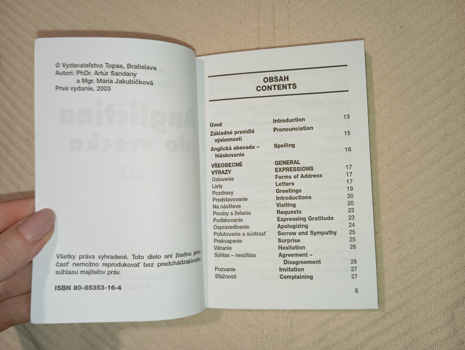 Knižka uvádza najpoužívanejšie výrazy v anglickej komunikácii pri rôznych príležitostiach, číslovky, farby, základná slovná zásoba, rozdiely medzi anglickou a americkou anličtinou v niektorých slovíčkach,základné informácie o anglicky hovoriacich krajinách, význam vysokoškolských titulov a pod.