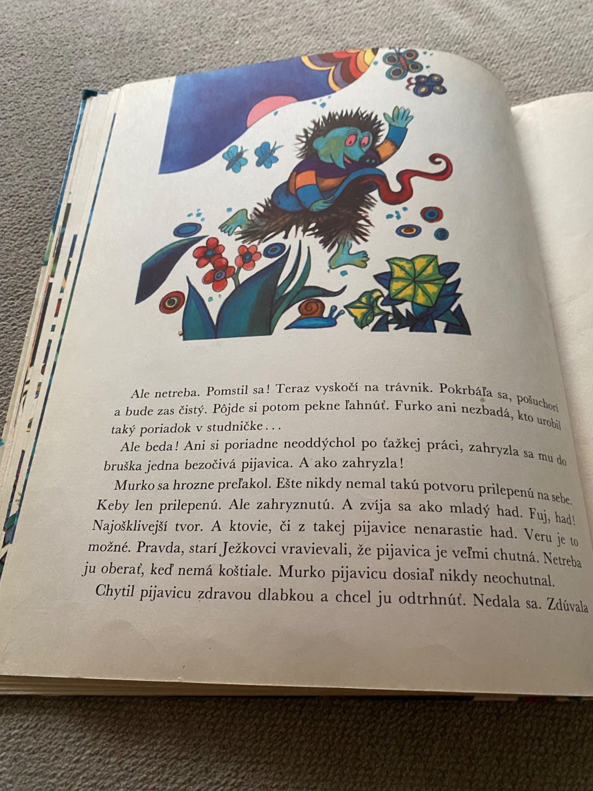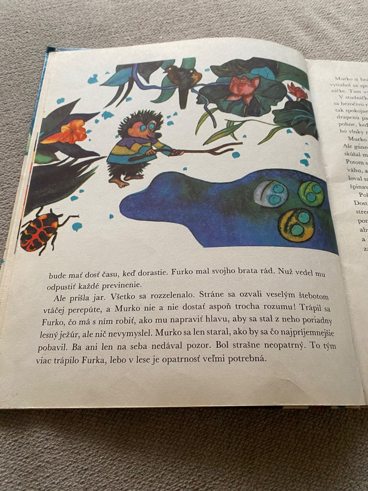 Les, pramienok, studnička, starý dub, lieskový ker — všetko na slnečnom úbočí hory. Dolu, pod studničkou, zelená polianka, posiata borievčím. Kde-tu rastie na nej aj smrečok. Pomedzi kriaky sa skoro bojazlivo prepletá malý jarček, ktorý studnička napája čistou vodou. A za lieskovým krom hrbí sa veľká, machom porastená skala. Už od nepamäti bývalo pod ňou pokolenie Ježkovcov. Keď sa povťahovali do jamky, vystlanej machom a suchým lístím, cítili sa celkom bezpečne. V lete bol pod skalou príjemný chládok a v zime útulno, teplučko. A veru nikto sa k nim dostať pozlotky nemohol. Keď zapchali otvor kamienkom, stal sa ich domov nedobytným hradom. Ani len líška Lupaku ich nemohla ohroziť, čo sa ako namáhala, ani vretenica Fu. Veru nie. Ale poslednej jari bolo pod skalou smutno. Po veľkej poľovačke les skoro vymrel. Dlho sa nikto neodvážil ani len pípnuť. Aj starí Ježkovci vtedy ostali nezvestní. Stratili sa, ani čo by ich čierna zem pohltila. Ktovie, čo sa s nimi stalo! Ani sojka Pche o nich nevedela, hoci prebrnkala krížom-krážom celý les a pole. Len Furko, Murko a Furkova žienka Mucka sa zachránili. Dlho, veľmi dlho sa neodvažovali vykuknúť spod skaly. Gazdovali na tom, čo mali na zimu nasušené a čo ešte starí Ježkovci nazhromaždili. Ale aj tak sa zásoby míňali. Bedlivý Furko starostlivo obzeral, skúmal, odhadoval, dokedy ešte strava vystačí. Často vykukol spod skaly. Netrpezlivo čakal, kým sa sneh rozpustí, aby si mohli nazbierať čerstvej potravy a prebehnúť sa pomedzi kružiny, lebo údy od drepenia v diere mali nebodaj skoleničené.