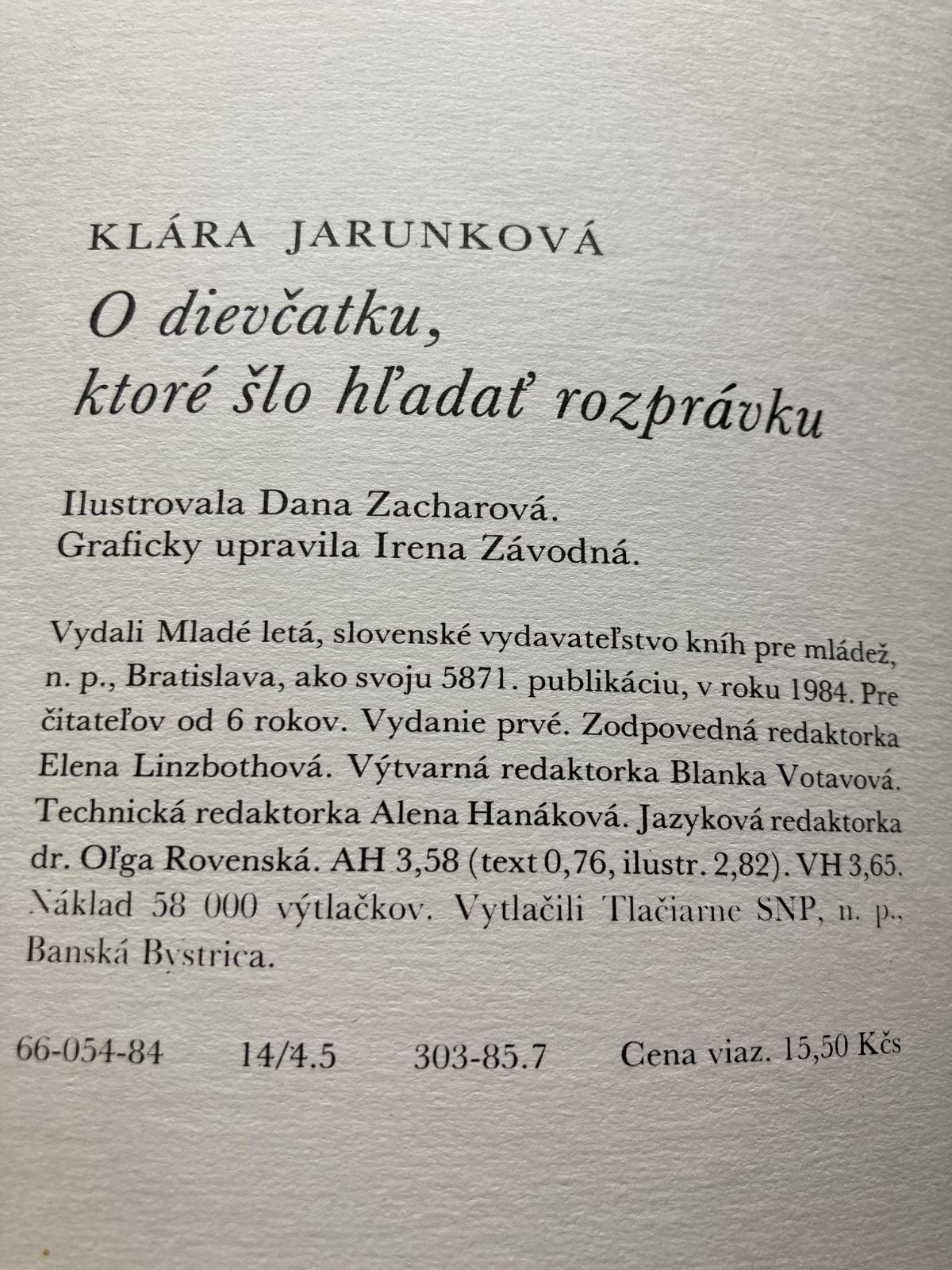 🔹Kniha O dievčatku, ktoré šlo hľadať rozprávku je detská kniha od slovenskej spisovateľky Kláry Jarunkovej, ktorú v roku 1984 vydalo vydavateľstvo Mladé letá v edícii Klub mladých čitateľov. Toto 1. vydanie ilustrovala Dana Zacharová.