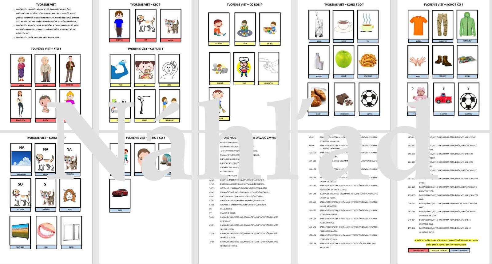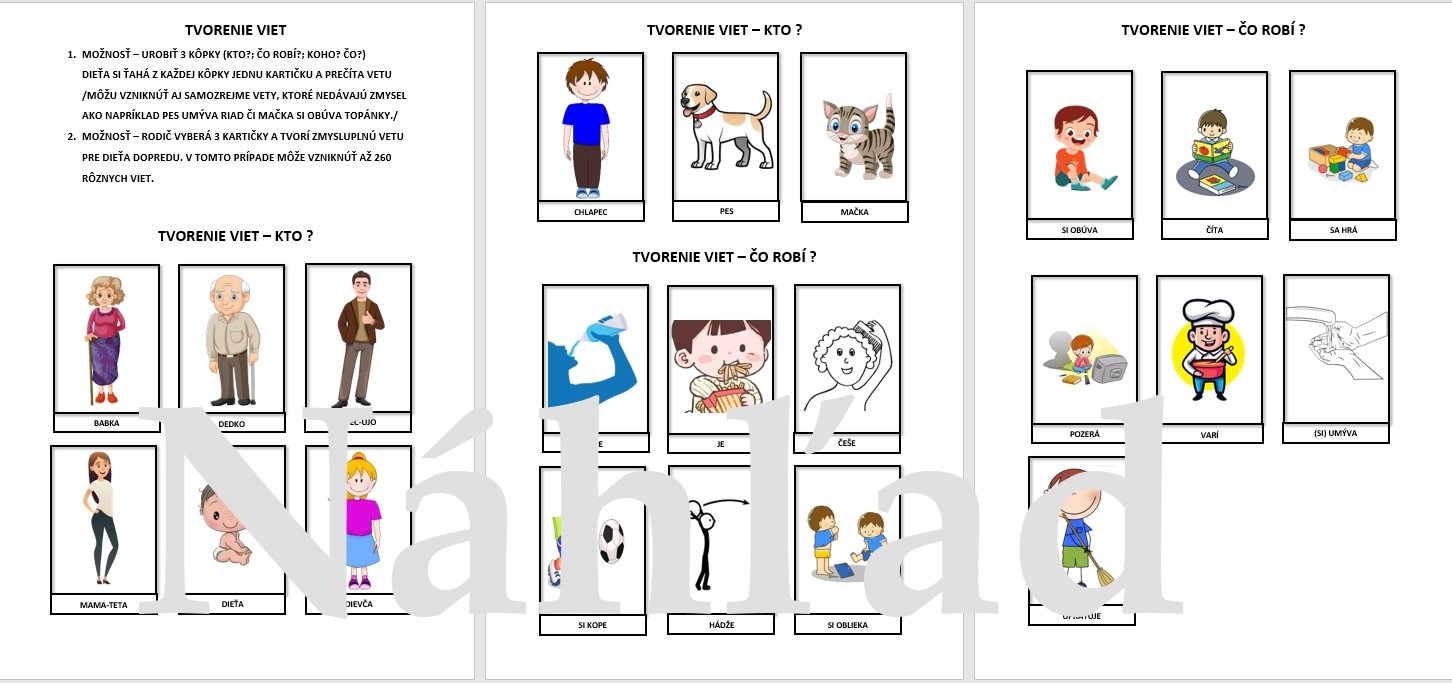Ponúkam PDF súbor na tvorbu viet. Obsahuje 7 osôb, 2 zvieratá, 13 činností a 31 predmetov, ktoré danú vetu rozvíjajú na trojslovnú. Stačí rozstrihať a dávať dieťaťu pomenovať podľa obrázkov. Môže vzniknúť až 260 zmysluplných trojslovných viet! Oveľa viac nezmyselných viet - ako napríklad "Mačka varí hranolky" no tá radosť keď dieťa vytvorí správnu vetu podľa obrázkov je nenahraditeľná 🙂 Samozrejme sa dá začať aj s dvojslovnými vetami a postupne pridávať slová 🙂