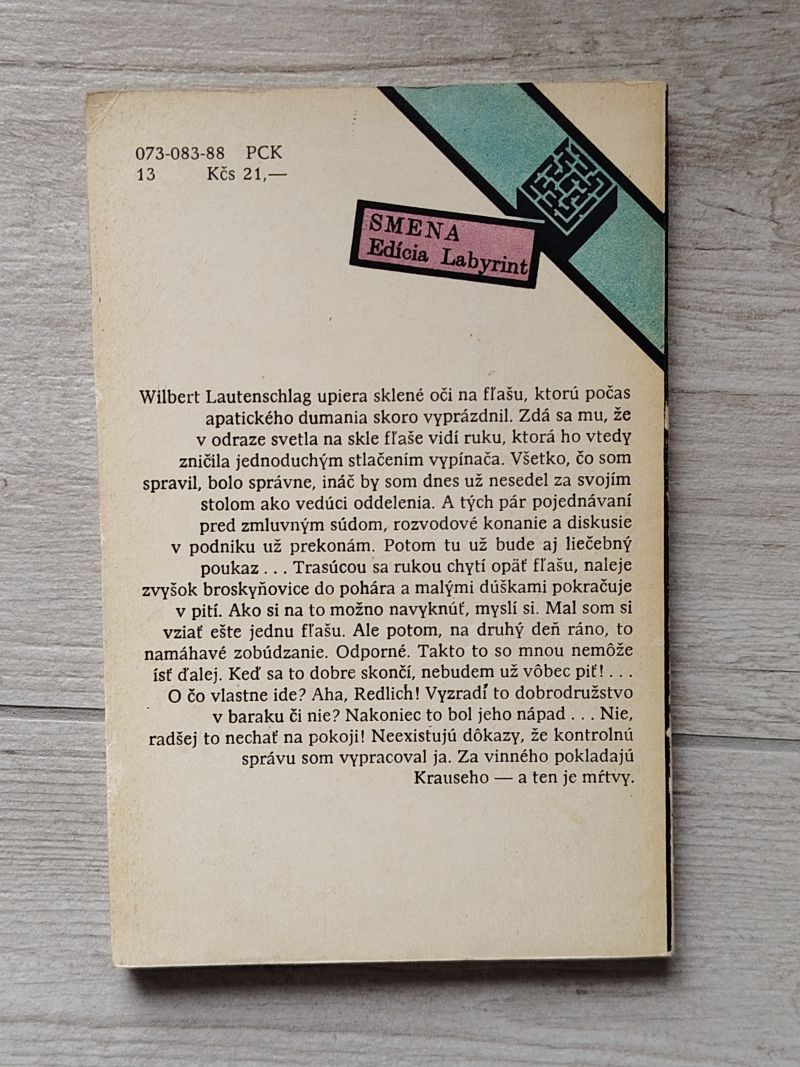 Napínavý detektívny príbeh. Wilbert Lautenschlag upiera sklené oči na fľašu, ktorú počas apatického dumania skoro vyprázdnil. Zdá sa mu, že v odraze svetla na skle fľaše vidí ruku, ktorá ho vtedy zničila jednoduchým stlačením vypínača...