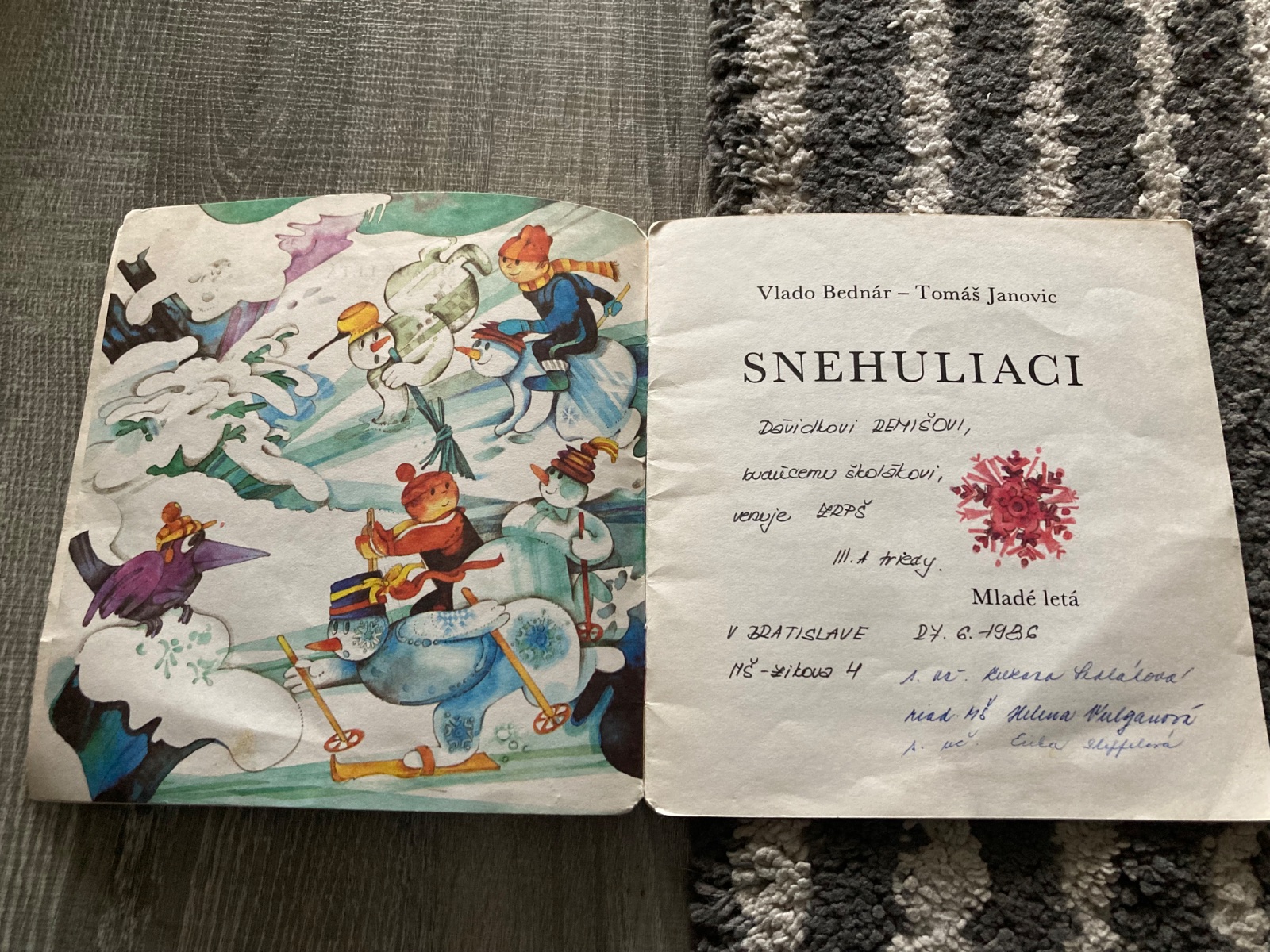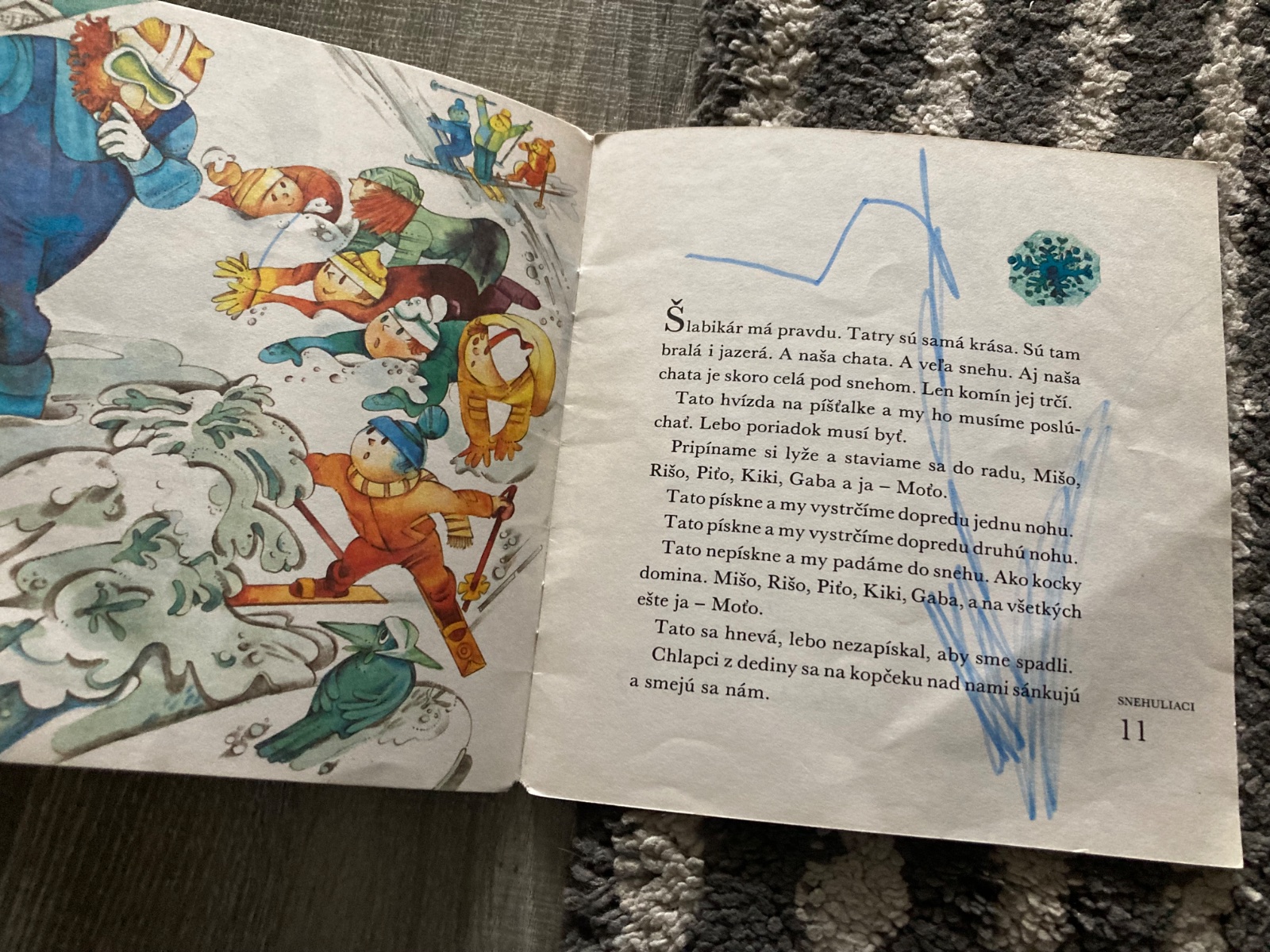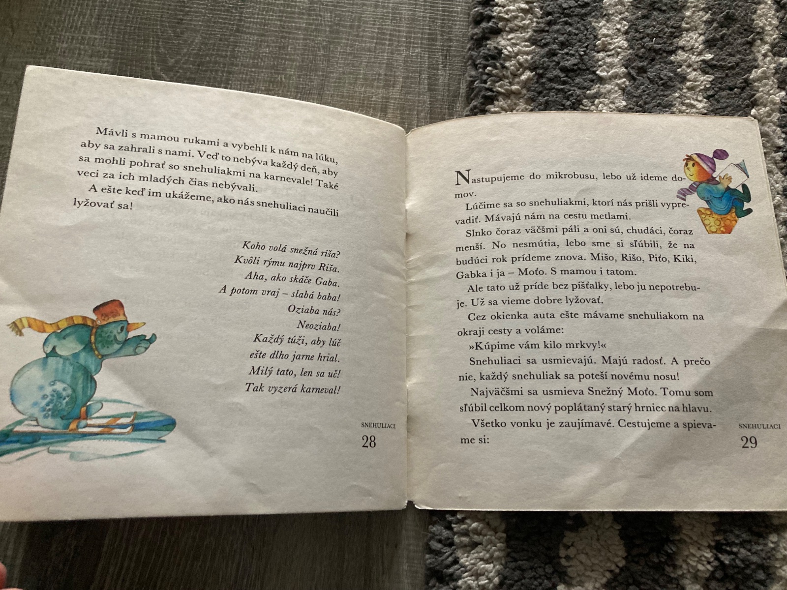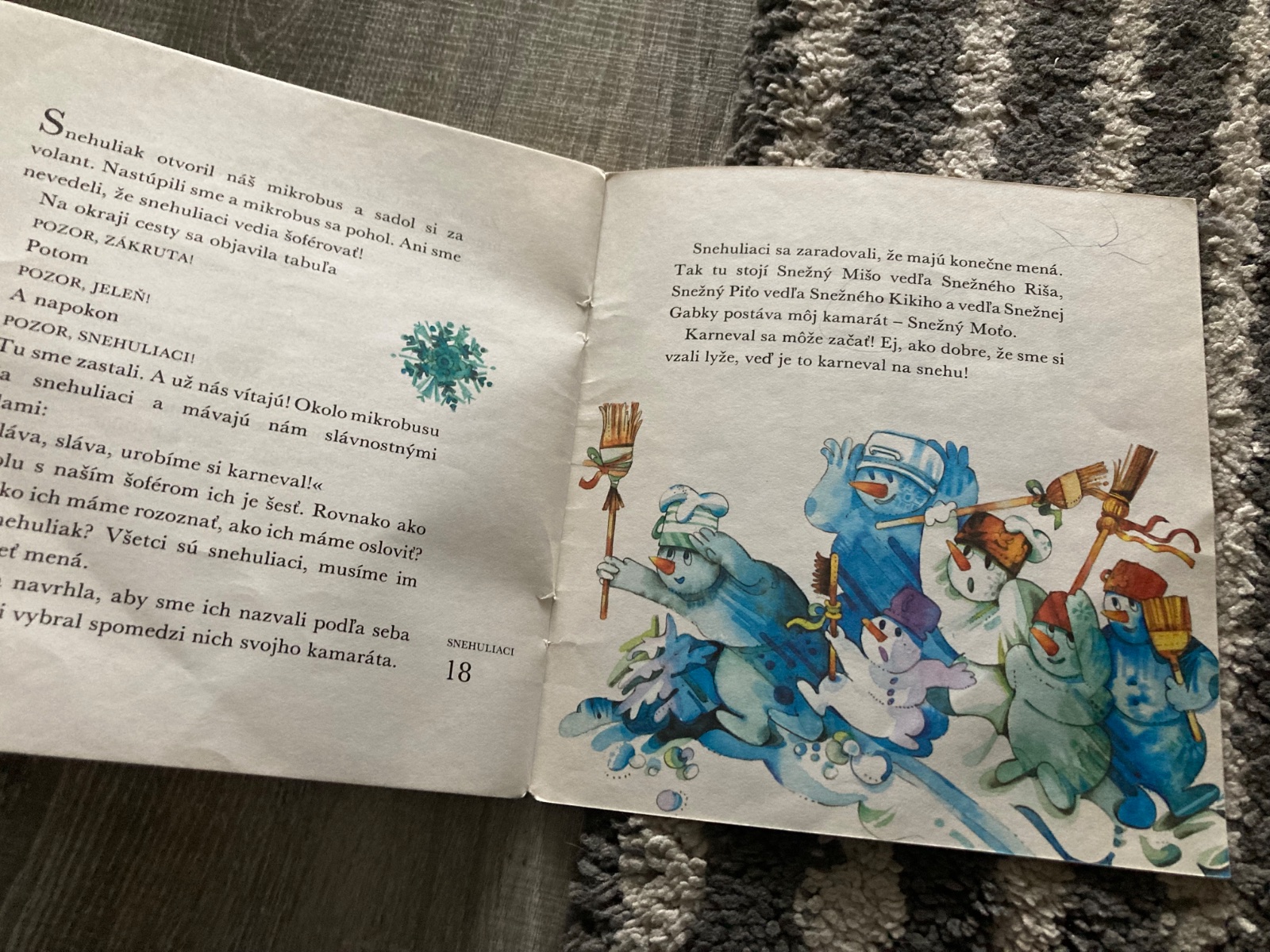 📌Chlapci z dediny postavili na lúke snehuliaka. Takého obyčajného, s mrkvou miesto nosa, deravým hrncom na hlave a uhlíkmi miesto očí. Aj my staviame snehuliaka.Ale nie obyčajného, guľatého. Tato nám nakreslil do snehu tri kocky, a tak staviame kockovitého snehuliaka. Nedarí sa nám to. Niekedy je sneh guľkatý, ten je dobrý na guľatého snehuliaka...