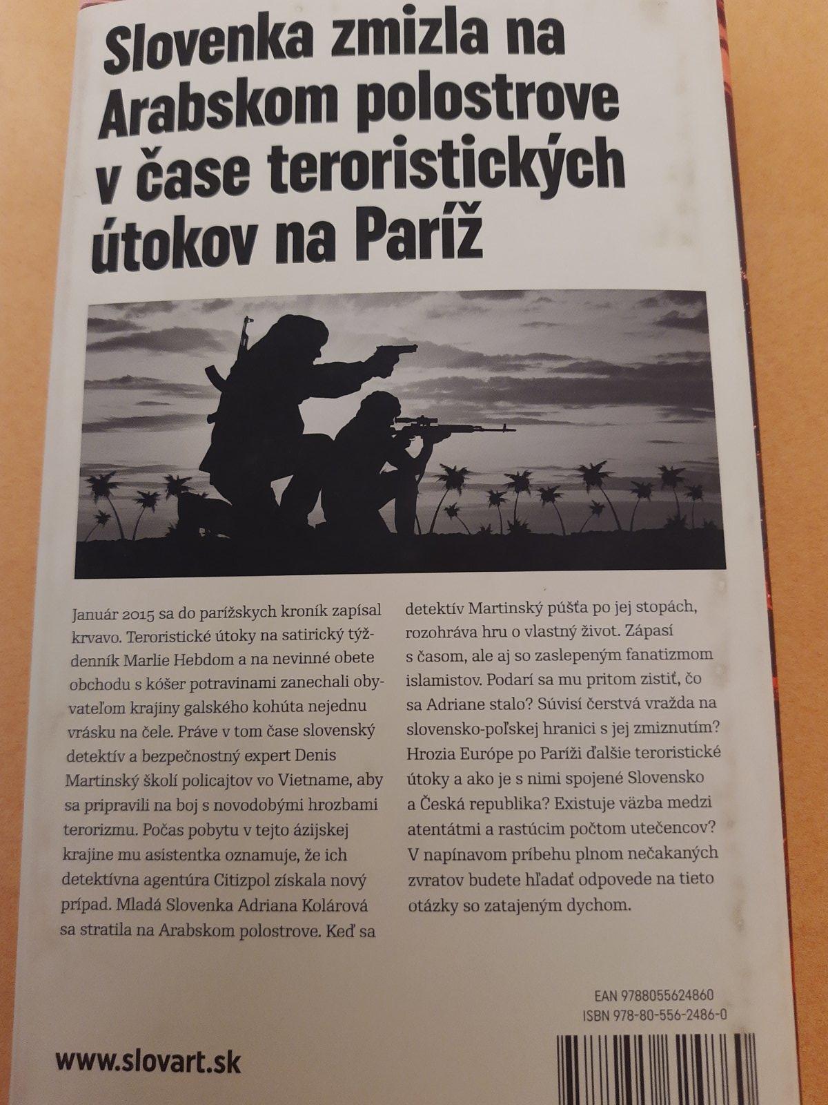 Január 2015 sa do parížskych kroník zapísal krvavým písmom. Teroristické útoky na satirický týždenník Marlie Hebdom a na nevinné obete obchodu s kóšer potravinami zanechali na čelách obyvateľov mesta nejednu vrásku. Práve v tom čase slovenský detektív a bezpečnostný expert Denis Martinský školí policajtov vo Vietname, aby sa pripravili na boj s novodobými hrozbami terorizmu. Počas pobytu mu asistentka Veronika oznamuje, že ich agentúra Citizpol získala nový prípad. Mladá Slovenka sa stratila na Arabskom polostrove. Detektív sa púšťa po jej stopách a rozohráva tak hru o vlastný život. Zápasí s časom aj so zaslepeným fanatizmom islamistov. Podarí sa mu zistiť, čo sa Slovenke stalo? Hrozia Európe po Paríži ďalšie teroristické útoky a ako je s nimi spojené Slovensko?