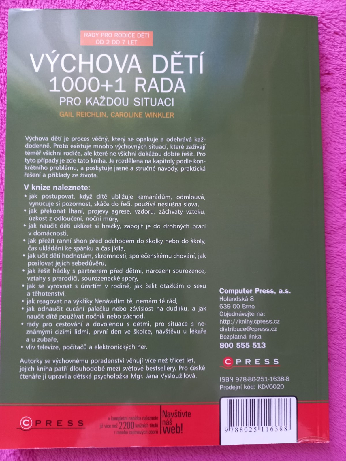 sa opakuje každý deň. Občas je ho zvládnuť bez ujmy veľmi ťažké. V tejto knihe je opísaných mnoho rôznych výchovných situácii ako postupovať. Kniha je zadelená na rôzne kapitoly podľa druhov problémov pri výchove. Obsah knihy je priblížený na zadnej strane( viď foto). Cena je pevná.