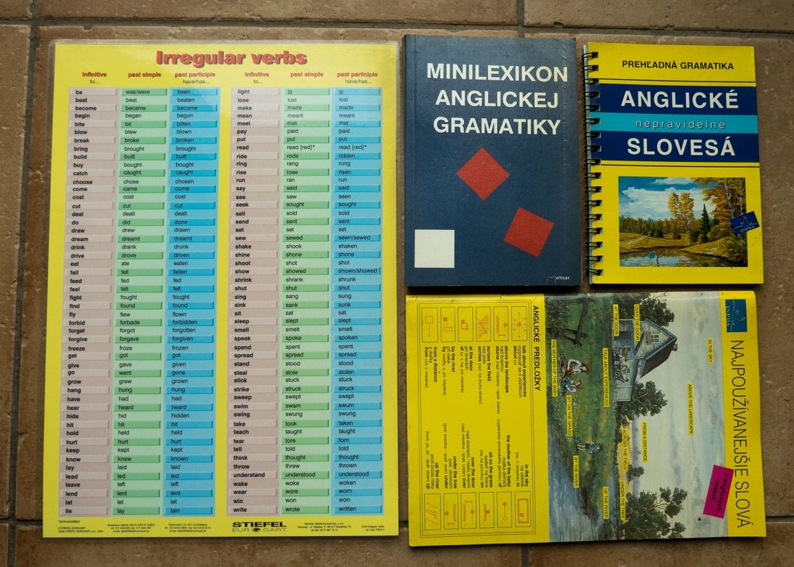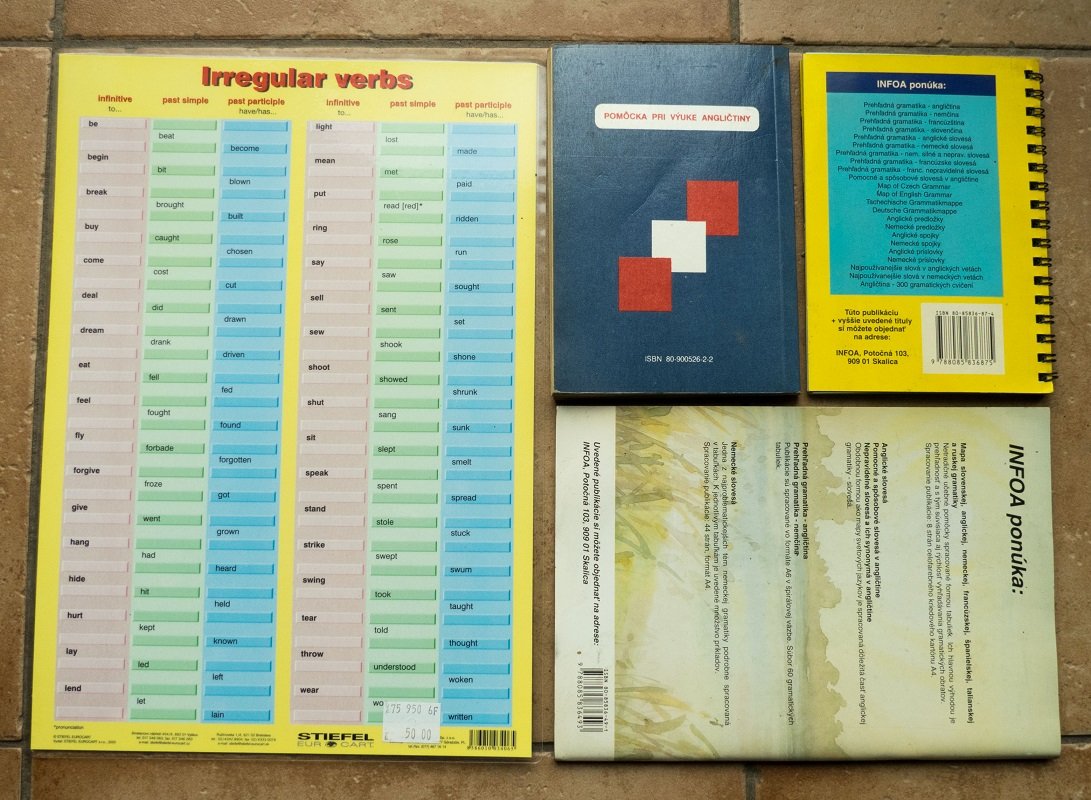 Predám 3 kusy knižiek týkajúcich sa anglickej gramatiky + zalaminátovaný prehľad nepravideľných slovies.