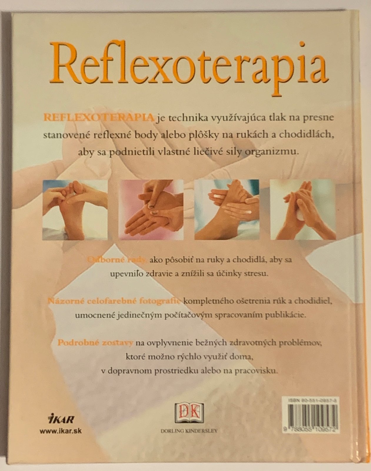 Reflexoterapia je technika využívajúca tlak na presne stanovené reflexné body alebo plôšky na rukách a chodidlách, aby sa podnietili vlastné liečivé sily organizmu. Odborné rady, ako pôsobiť na ruky a chodidlá, aby sa upevnilo zdravie a znížili sa účinky stresu. Názorné celofarebné fotografie kompletného ošetrenia rúk a chodidiel, umocnené jedinečným počítačovým spracovaním publikácie. Podrobné zostavy na ovplyvnenie bežných zdravotných problémov, ktoré možno rýchlo využiť doma, v dopravnom prostriedku alebo na pracovisku.