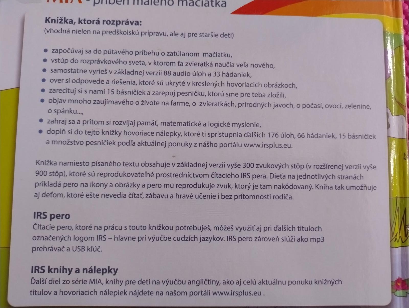 Treba k tejto knižke samozrejme originál hovoriace pero IRS,a stiahnuť z ich stránky do pera, príbeh mačičky Mia - je to jednoduché🙂