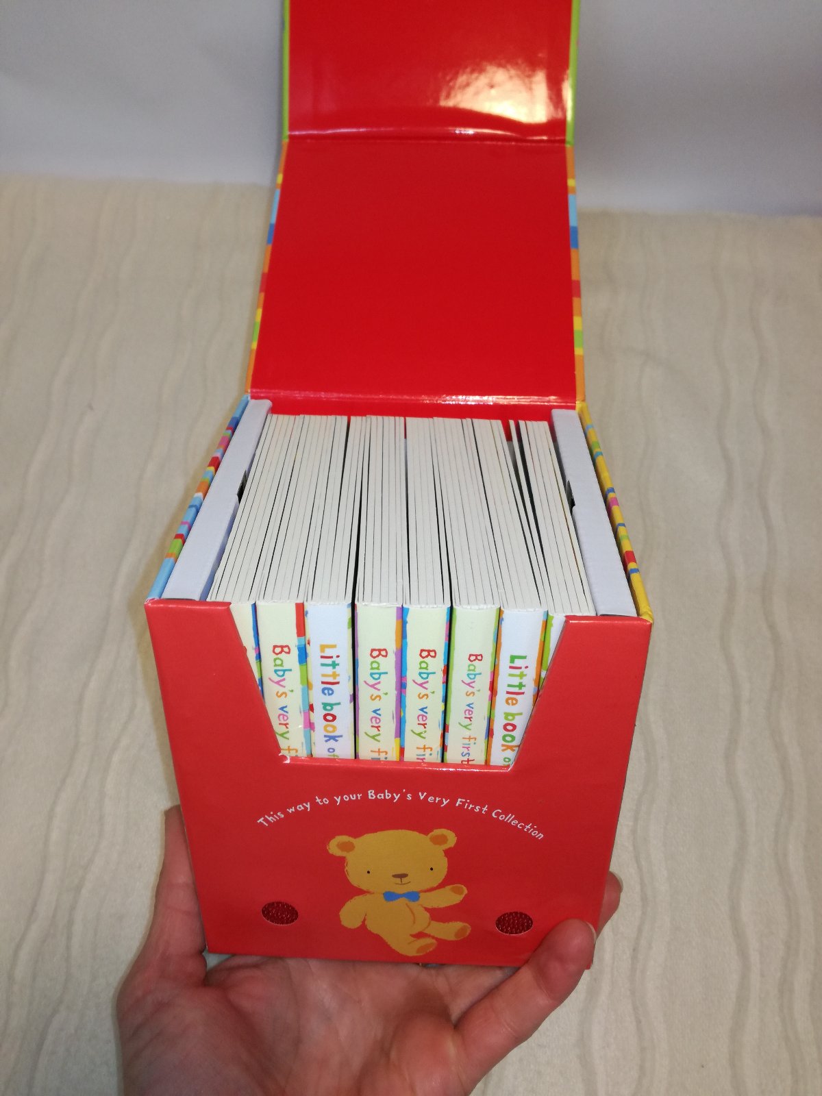 Kartonova kazeta ma znamky skladovania, kde tu mensi suchanec. Samotne leporelka podla mna neboli ani citane, otvaraju sa stale ako nove. Nebala by som sa ani pri detickach, co este vsetko davaju do pusy.