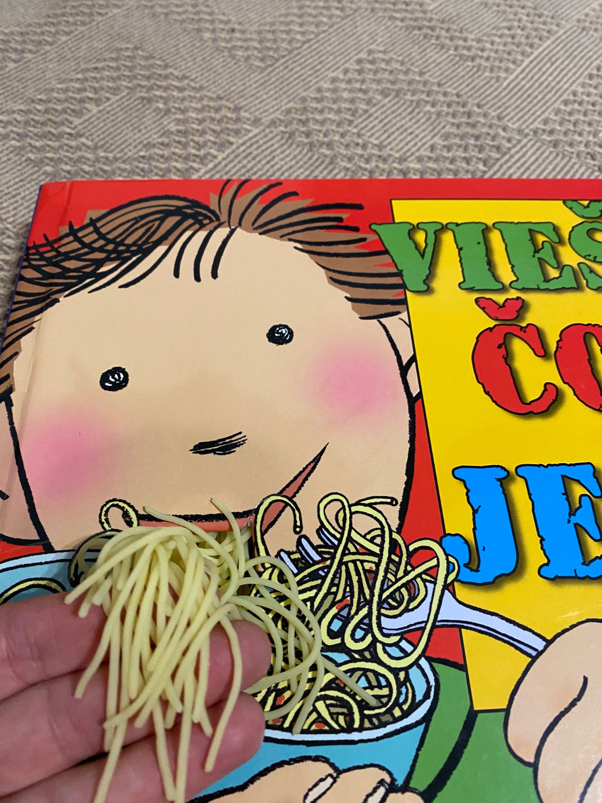 Detské Leporelo so skutočnými špagetami, ktoré môžu deti chytiť do ruky