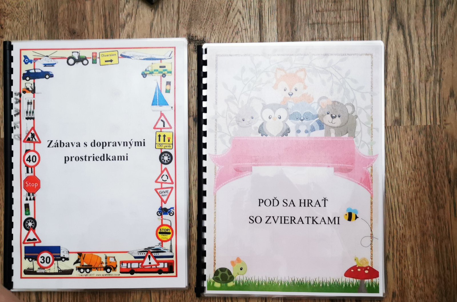 Pracovné zošity zalaminované s rôznymi témami - čísla, farby, dopravné prostriedky a Labková patrola.