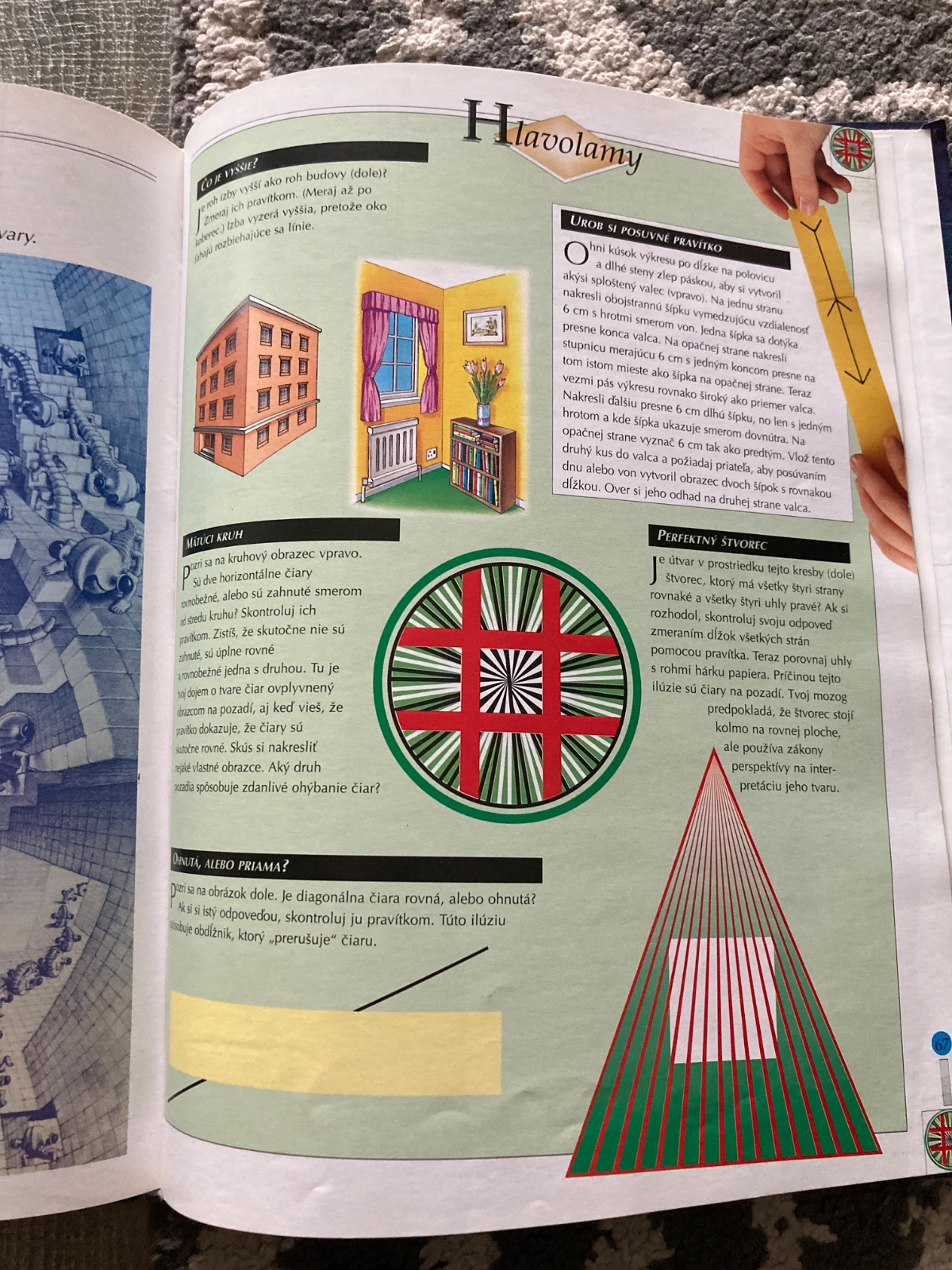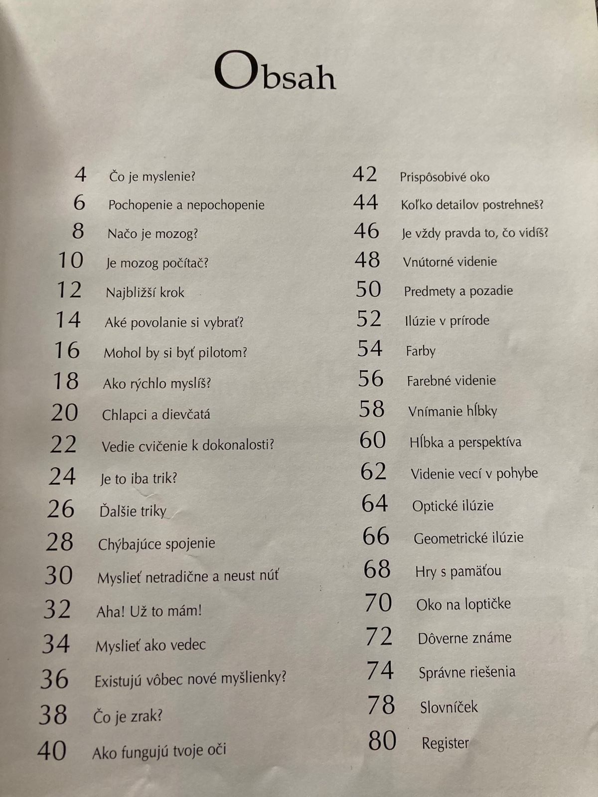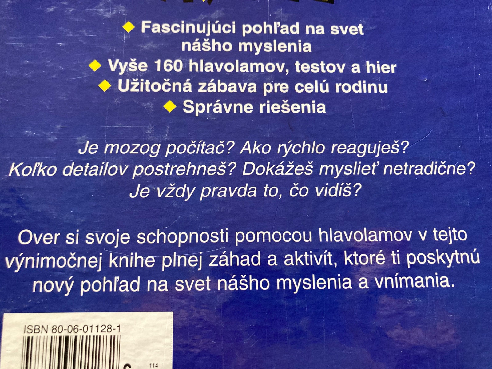 📌Vzrušujúce hry, testy a hlavolamy. Fascinujúci pohľad na svet nášho myslenia. Vyše 160 hlavolamov, testov a hier. Užitočná zábava pre celú rodinu. Správne riešenia. Je mozog počítač? Ako rýchlo reaguješ? Koľko detailov postrehneš? Dokážeš myslieť netradične? Je vždy pravda to, čo vidíš? Over si svoje schopnosti pomocou hlavolamov v tejto výnimočnej knihe plnej záhad a aktivít, ktoré ti poskytnú nový pohľad na svet nášho myslenia a vnímania.