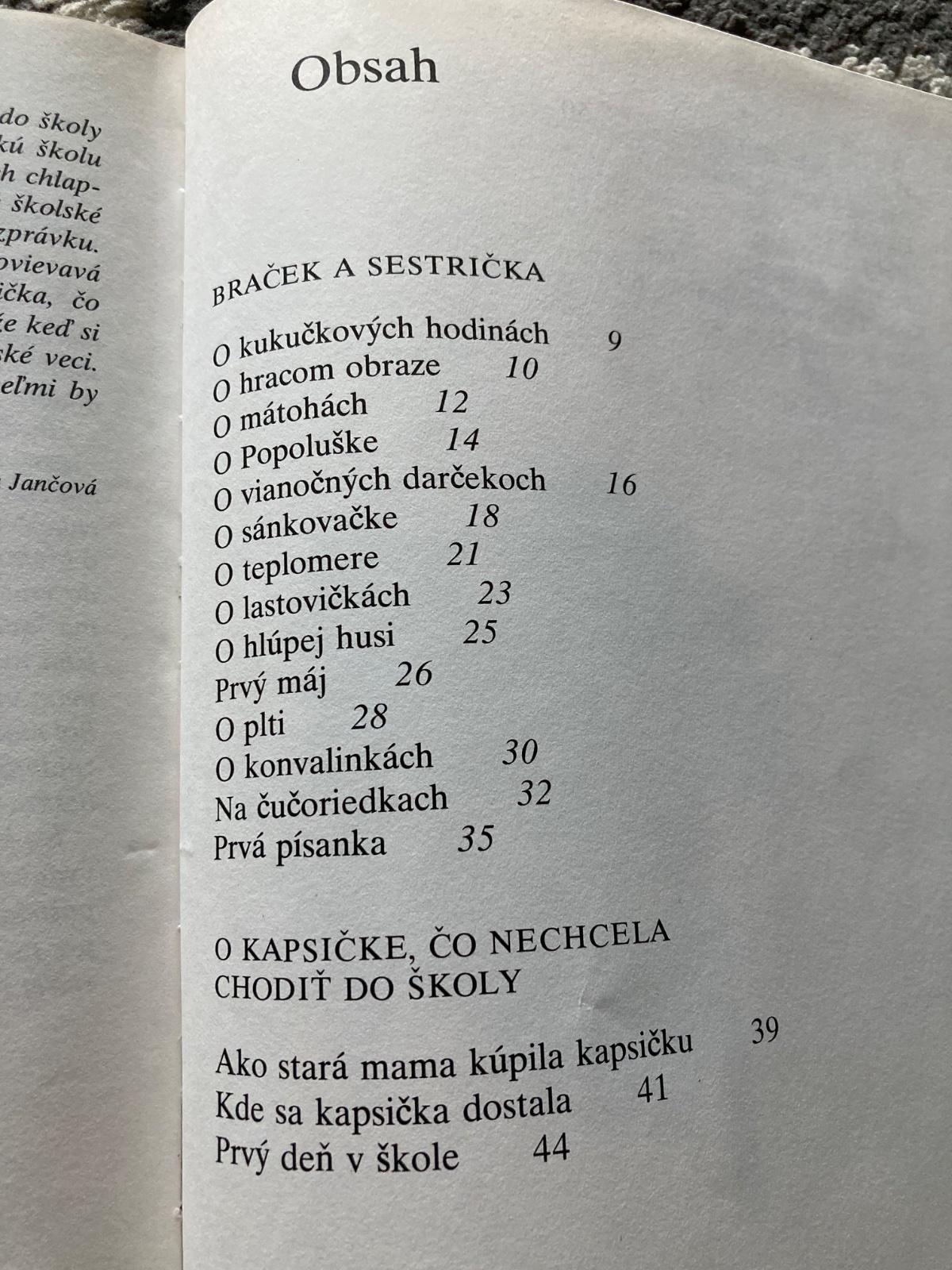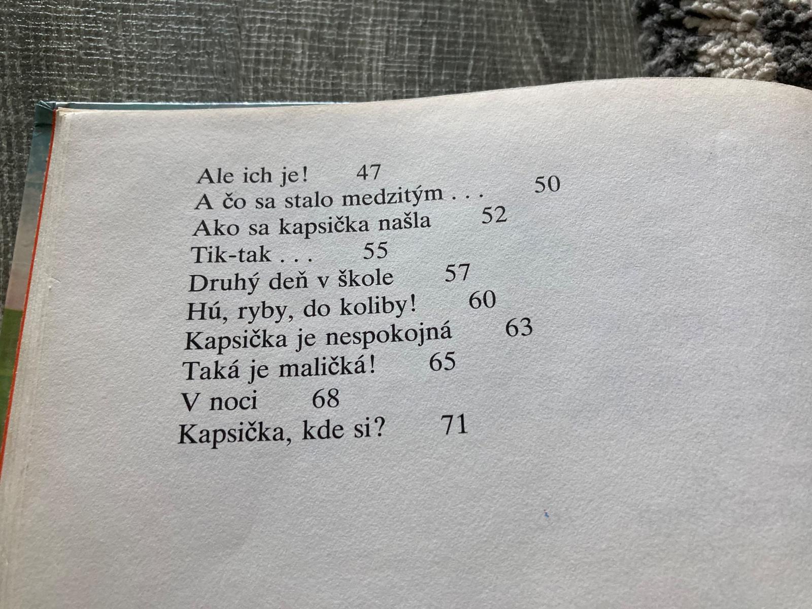 📌V prvej časti knihy nájdete príbeh o bratovi-prvákovi, ako pokazil hrací obraz a ako vložil do vriacej vody teplomer. Ale braček nerobil len zlé veci, ale aj dobré. Vytiahol svoju sestričku z vody, keď z plte spadla do rieky, našiel ju, keď v hore zablúdila pri hľadaní konvaliniek a chodili spolu na čučoriedky a na lieskovce a on vždy objavil najlepšie miesto... Druhú časť knižky tvoria príbehy o kapsičke, čo nechcela chodiť do školy, lebo o ňu nedbali.