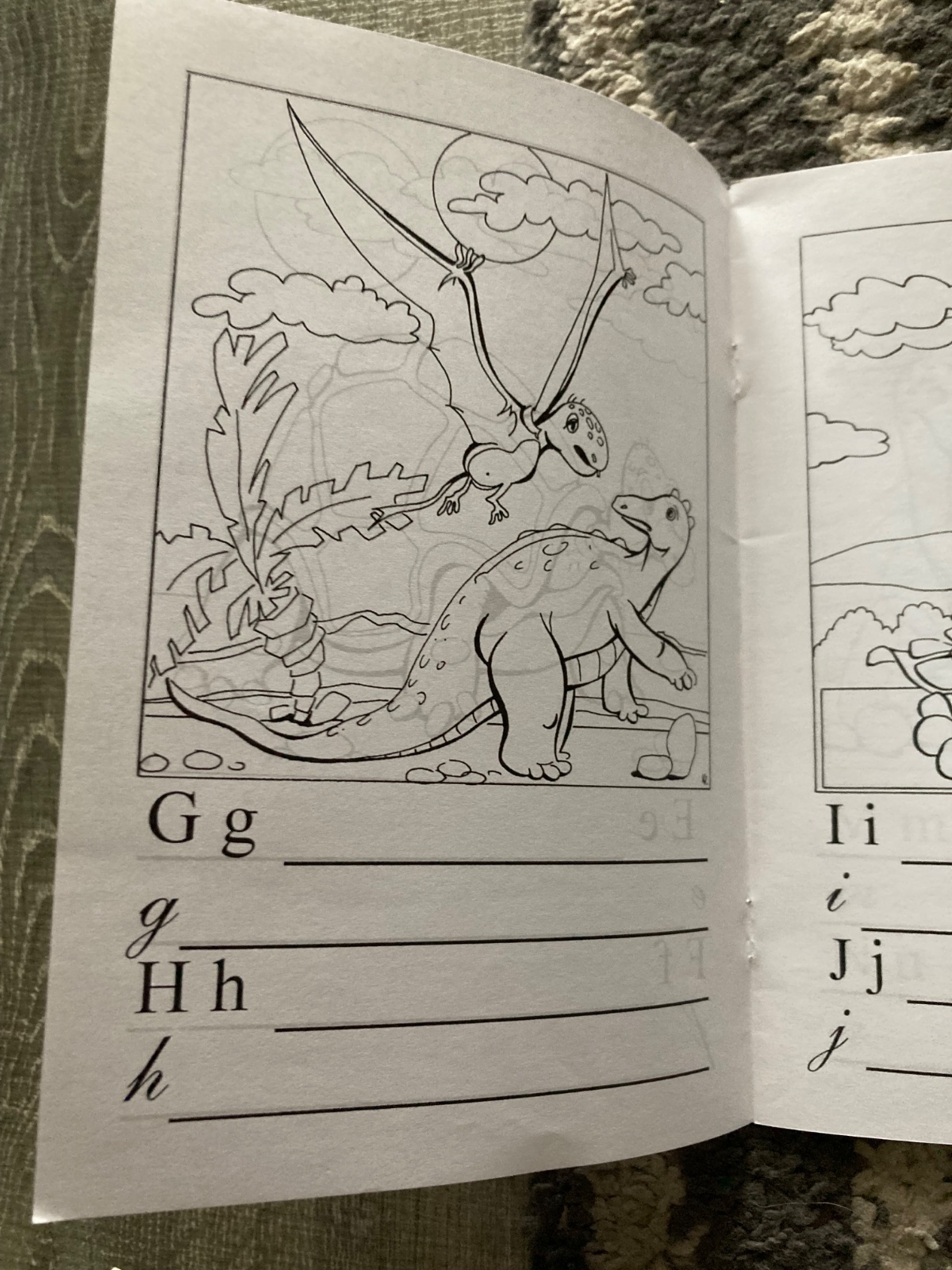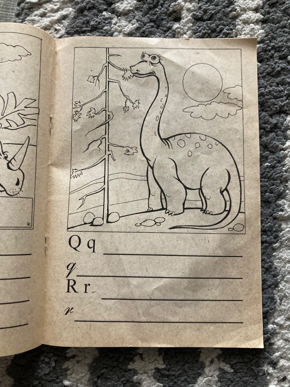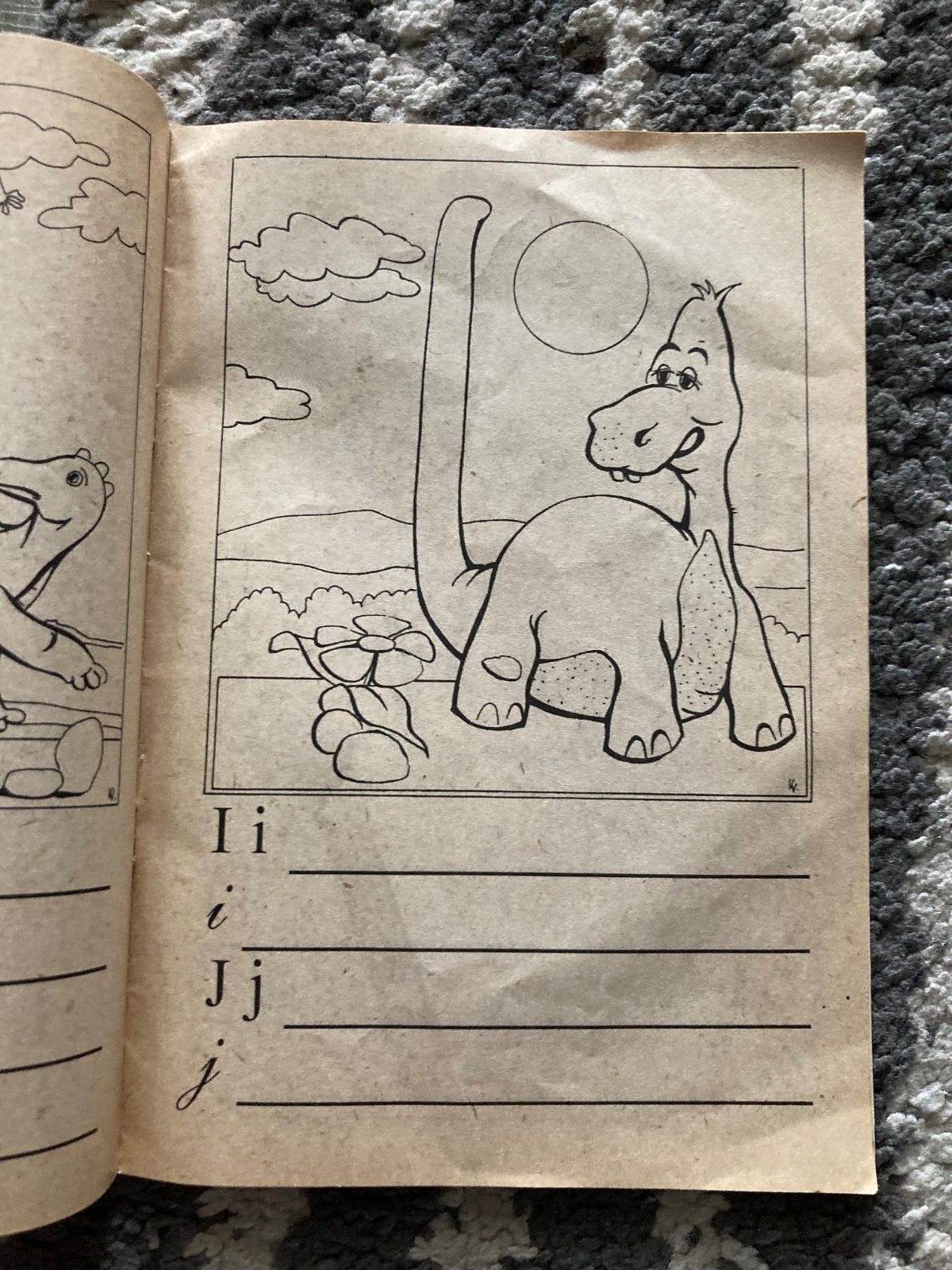 📌detský zošit s dinosaurami, ktorý kombinuje vymalovávanie a písanie abecedy a číslic.