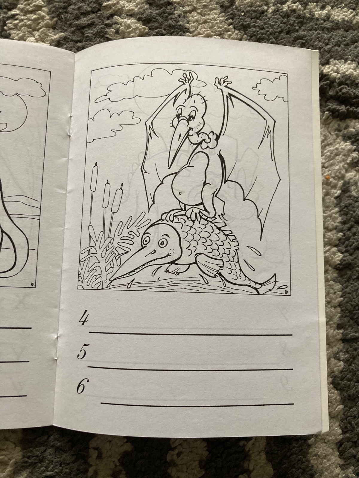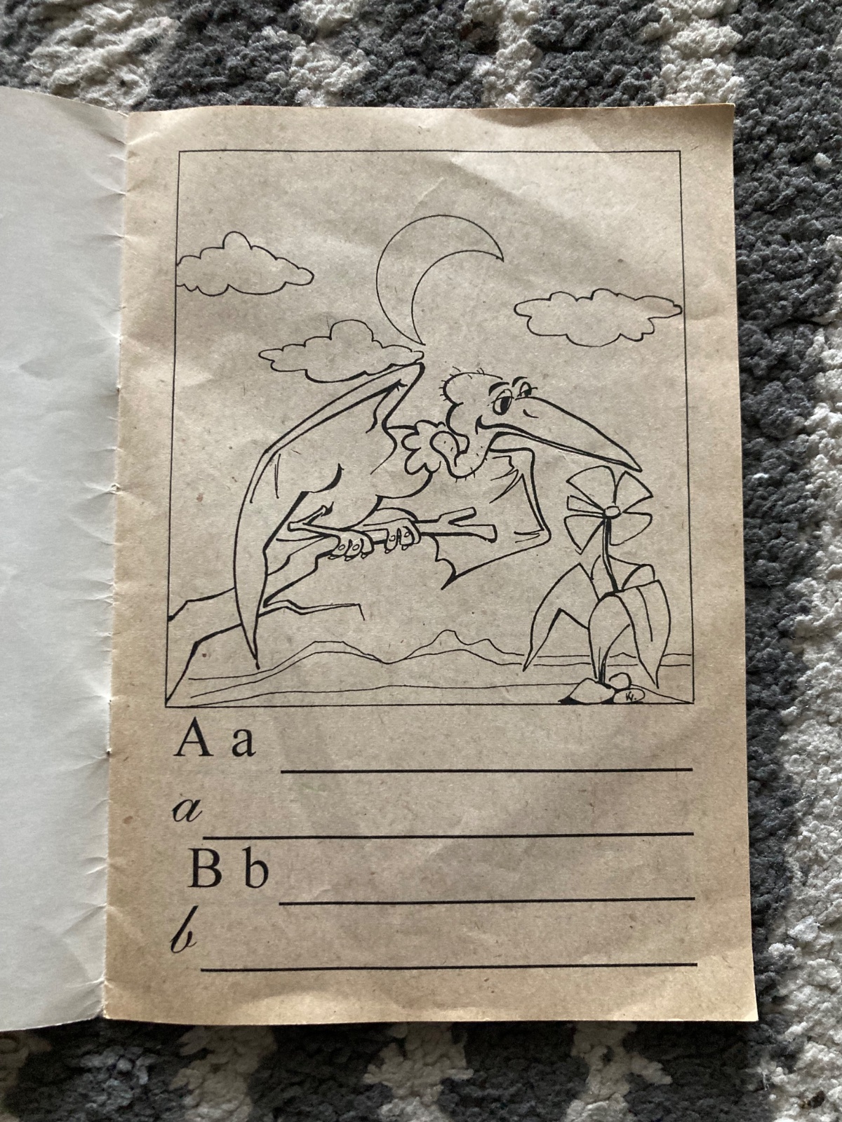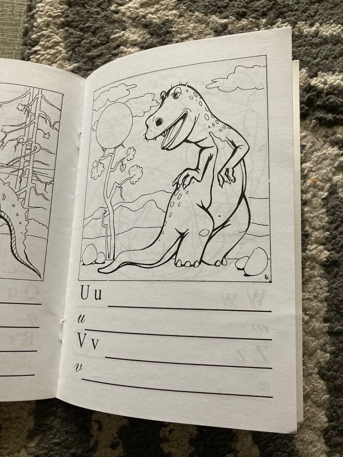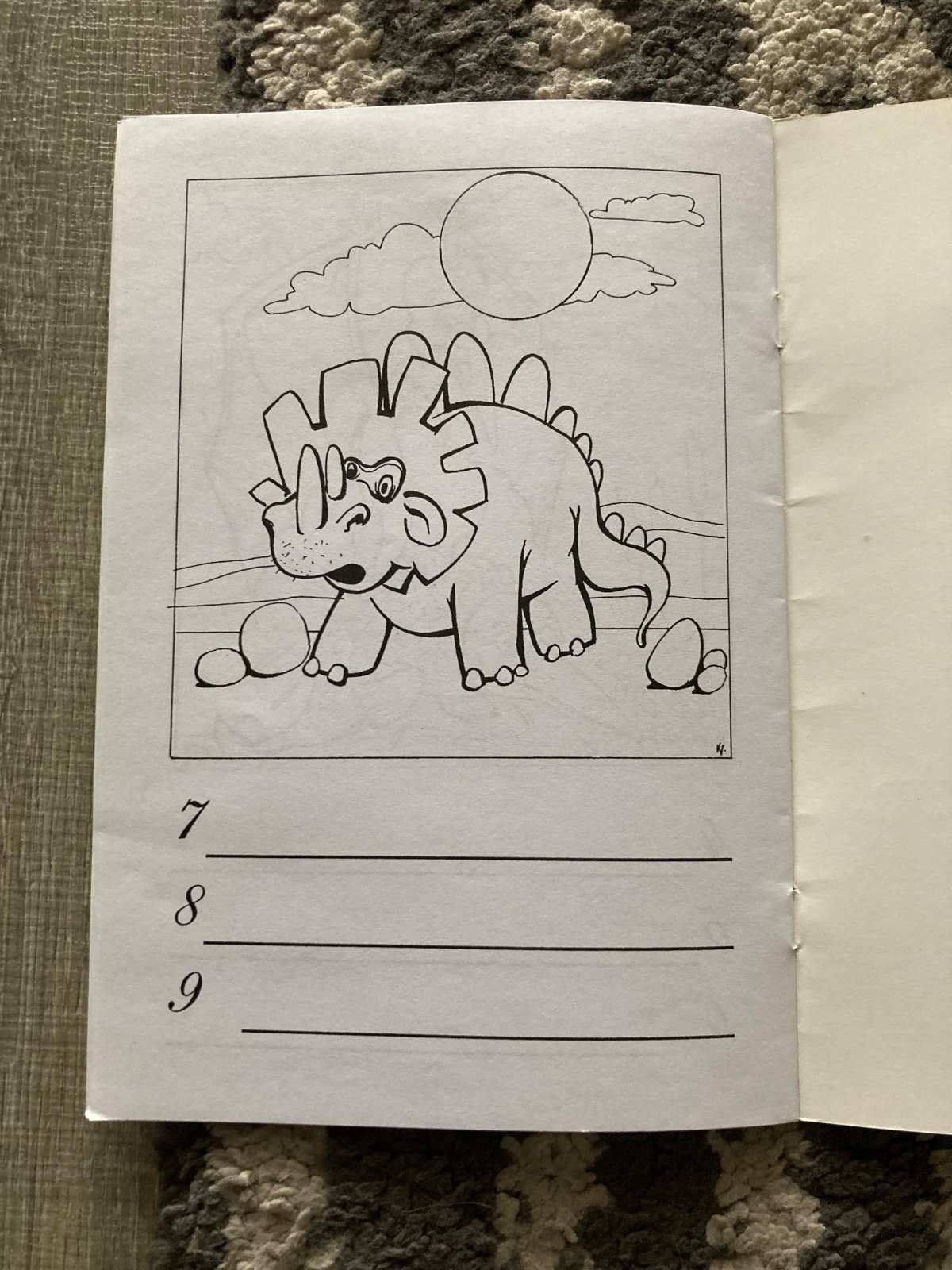 📌detský zošit s dinosaurami, ktorý kombinuje vymalovávanie a písanie abecedy a číslic.