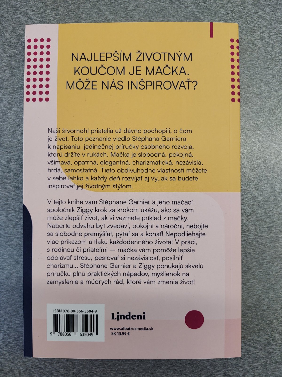 Mačka je slobodná, pokojná, všímavá, opatrná, elegantná, charizmatická, nezávislá, hrdá, samostatná. Tieto obdivuhodné vlastnosti môžete v sebe ľahko a každý deň rozvíjať aj vy, ak sa budete inšpirovať jej životným štýlom. V tejto knihe vám Stéphane Garnier a jeho mačací spoločník Ziggy krok za krokom ukážu, ako sa vám môže zlepšiť život, ak si vezmete príklad z mačky. Naberte odvahu byť zvedaví, pokojní a nároční, nebojte sa slobodne premýšľať, pýtať sa a konať! Nepodliehajte viac príkazom a tlaku každodenného života! V práci, s rodinou či priateľmi – mačka vám pomôže lepšie odolávať stresu, pestovať si nezávislosť, posilniť charizmu... Stéphane Garnier a Ziggy ponúkajú skvelú príručku plnú praktických nápadov, myšlienok na zamyslenie a múdrych rád, ktoré vám zmenia život!