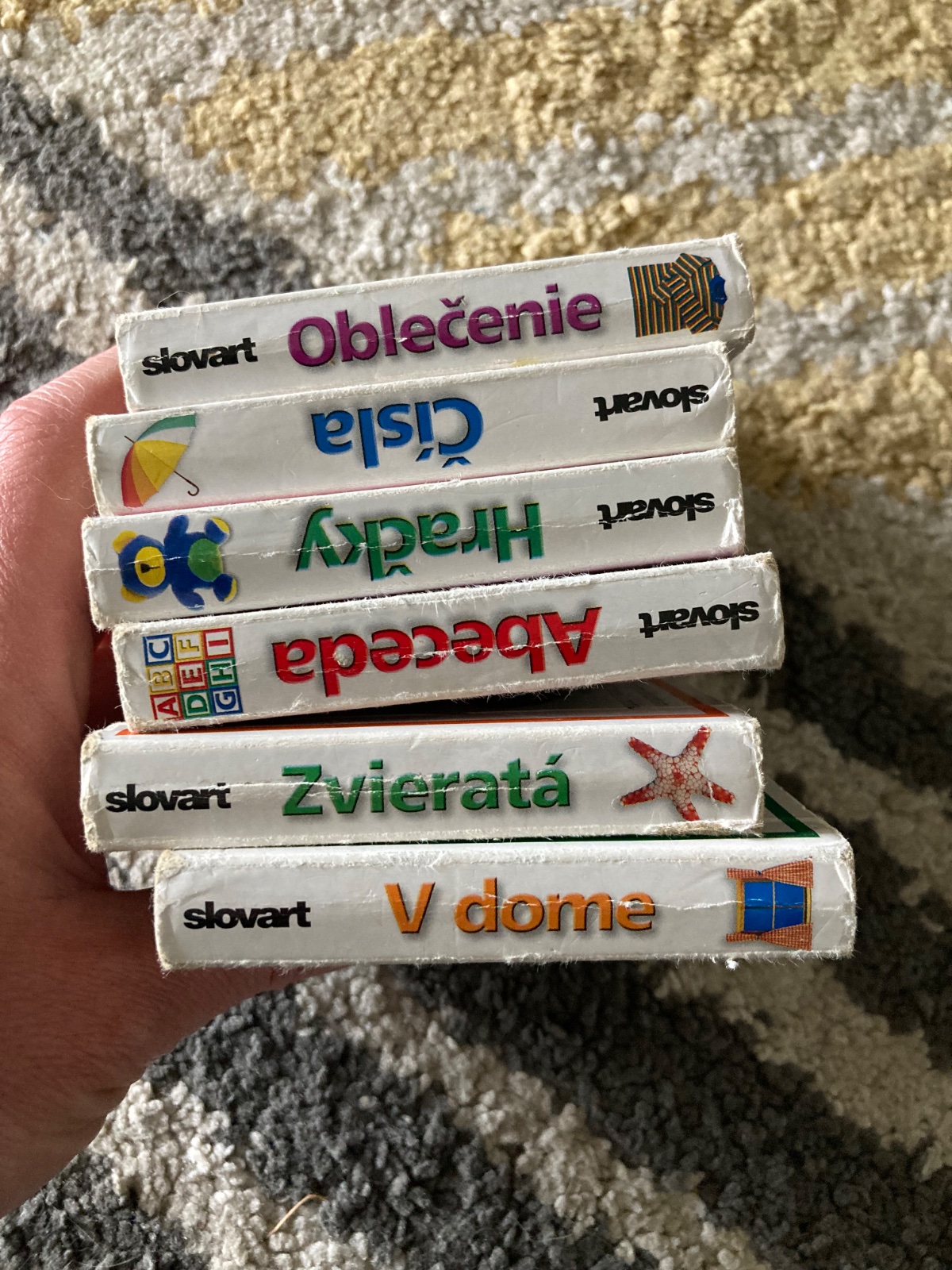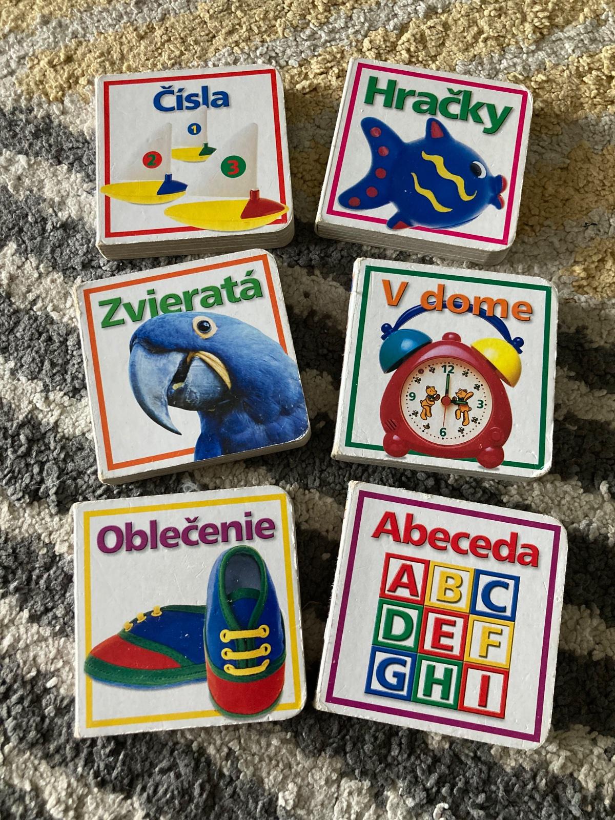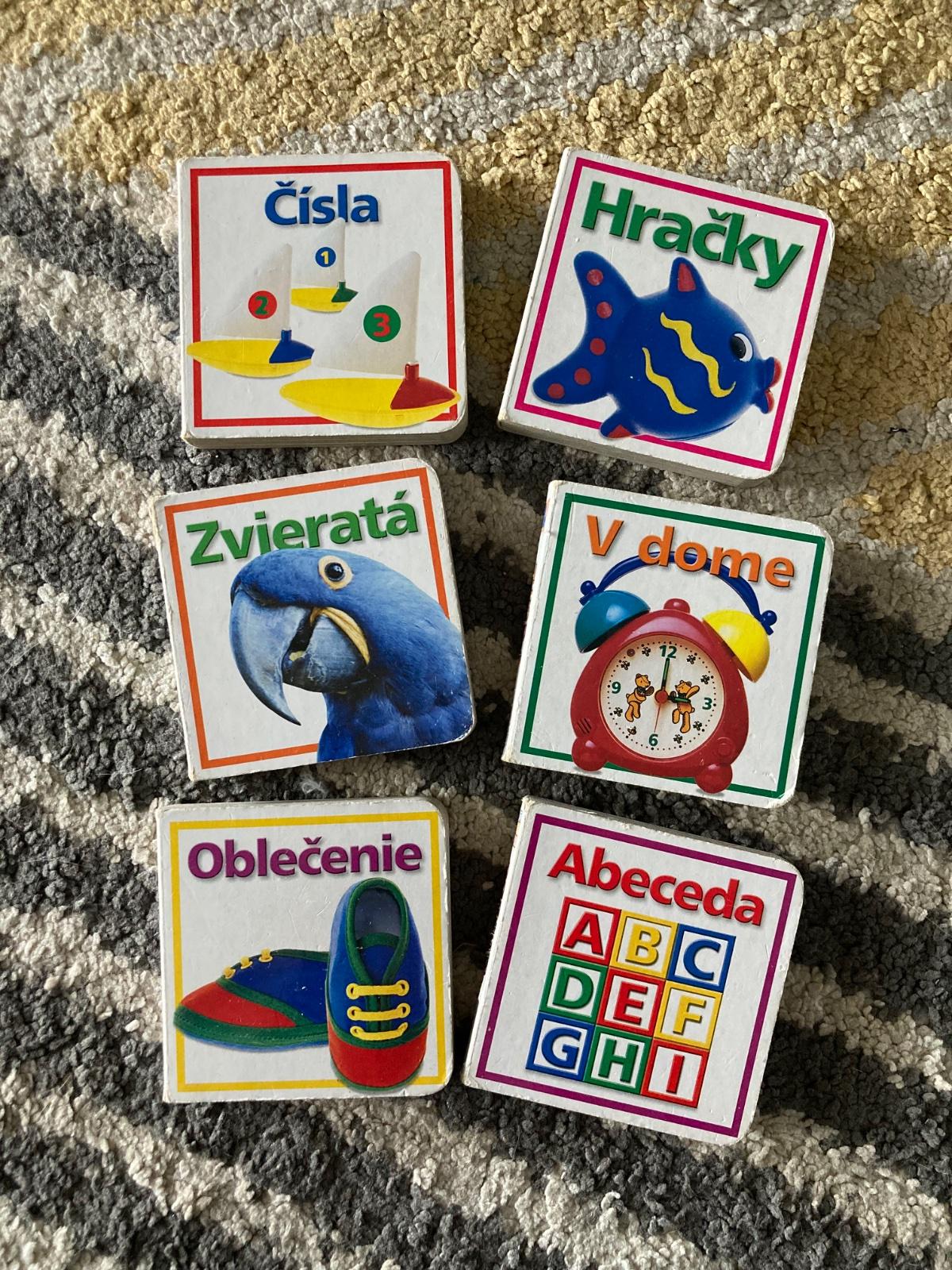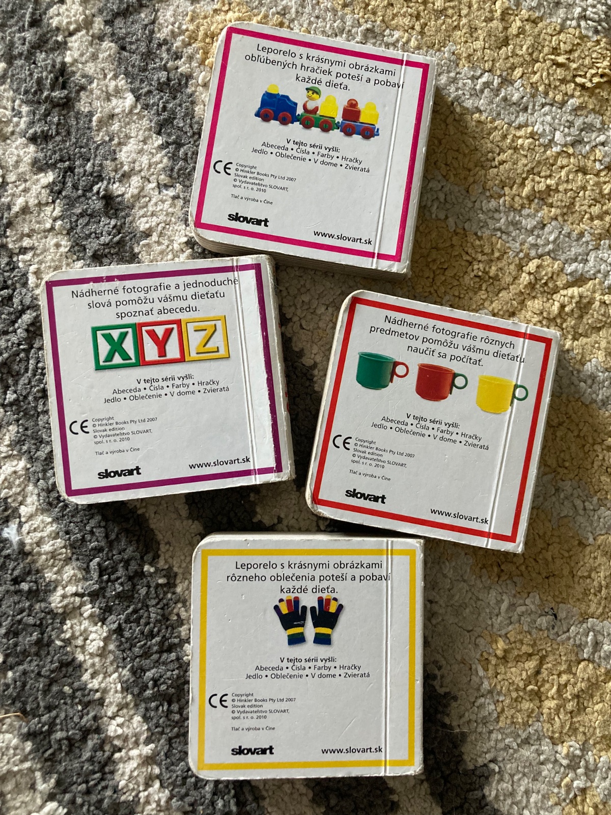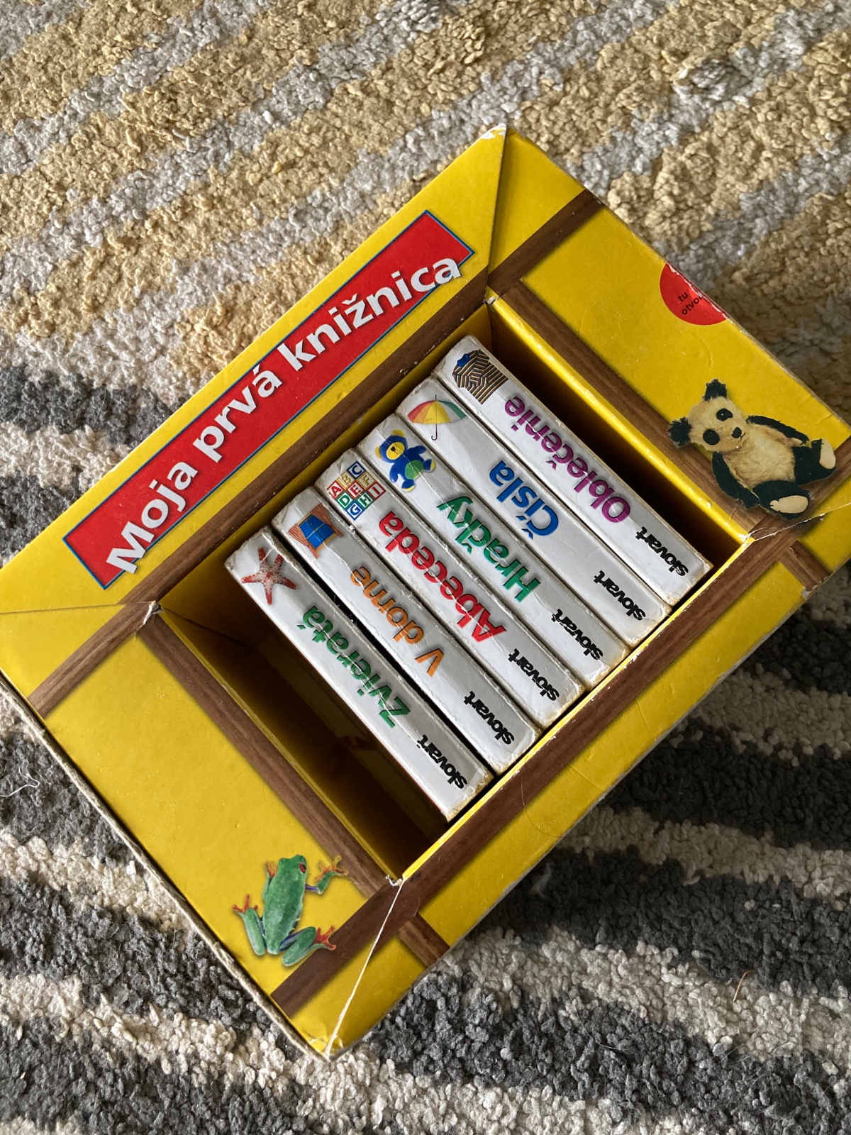 Moju prvú knižnicu tvoria leporelá: Abeceda, Čísla, Hračky, Oblečenie, V dome, Zvieratá.