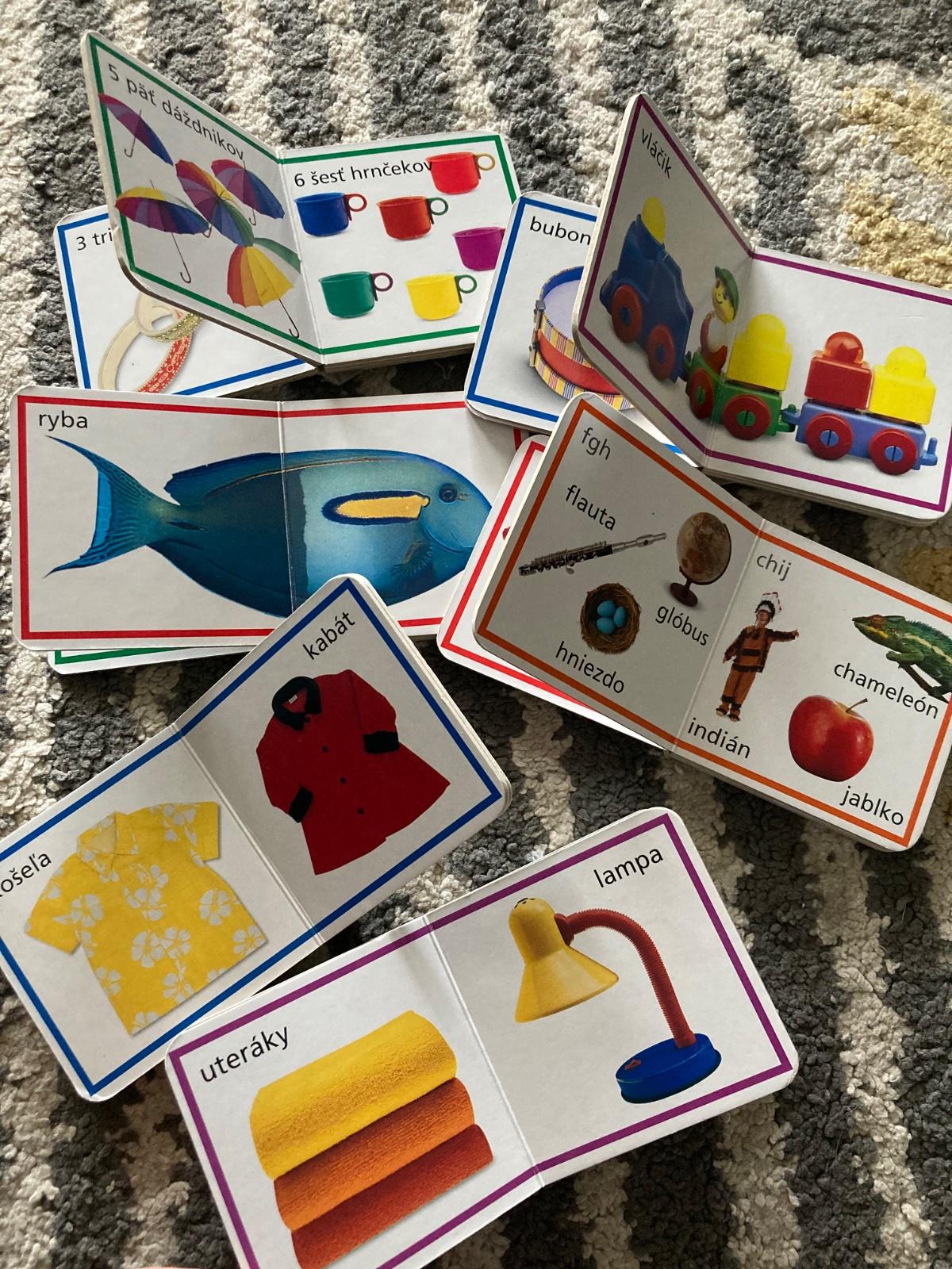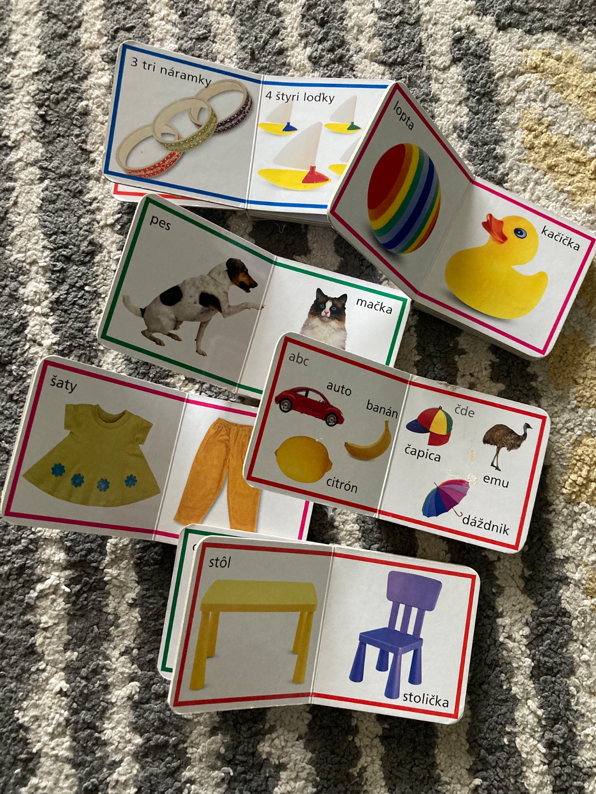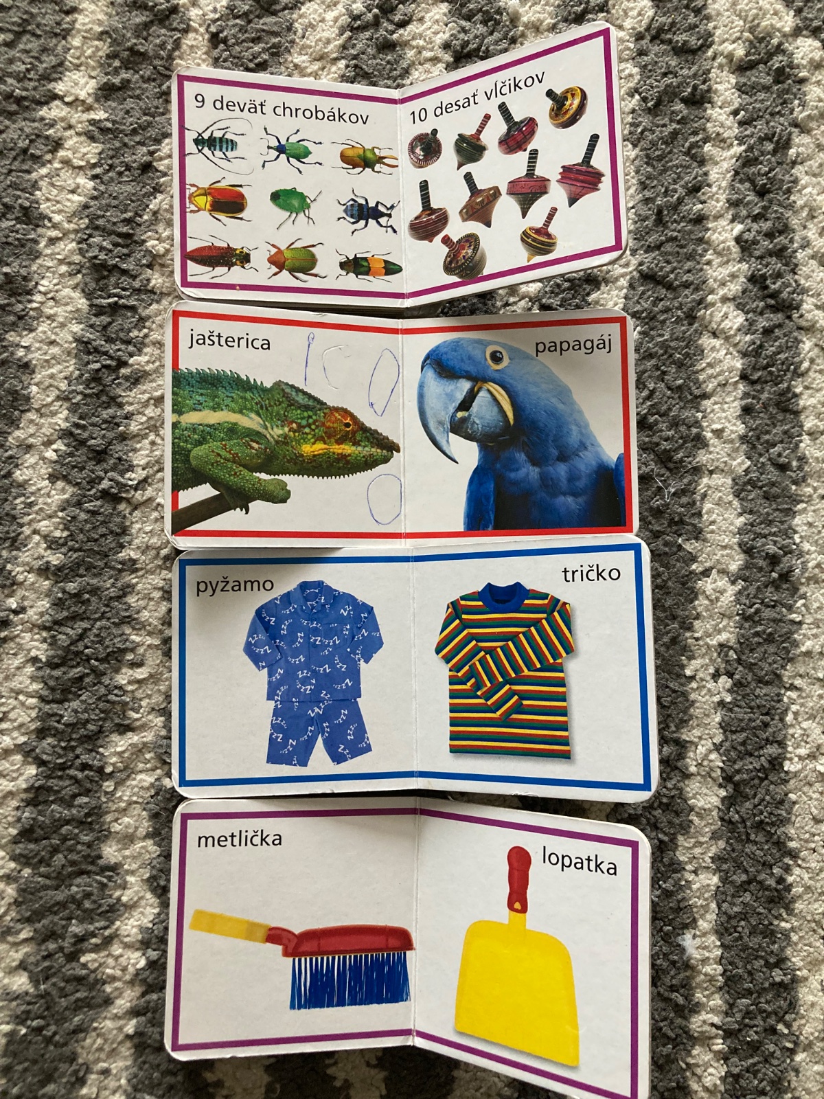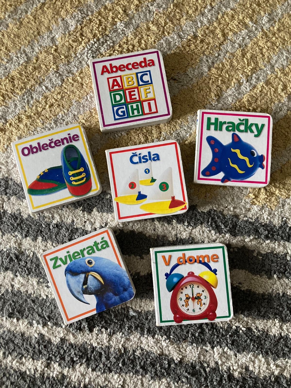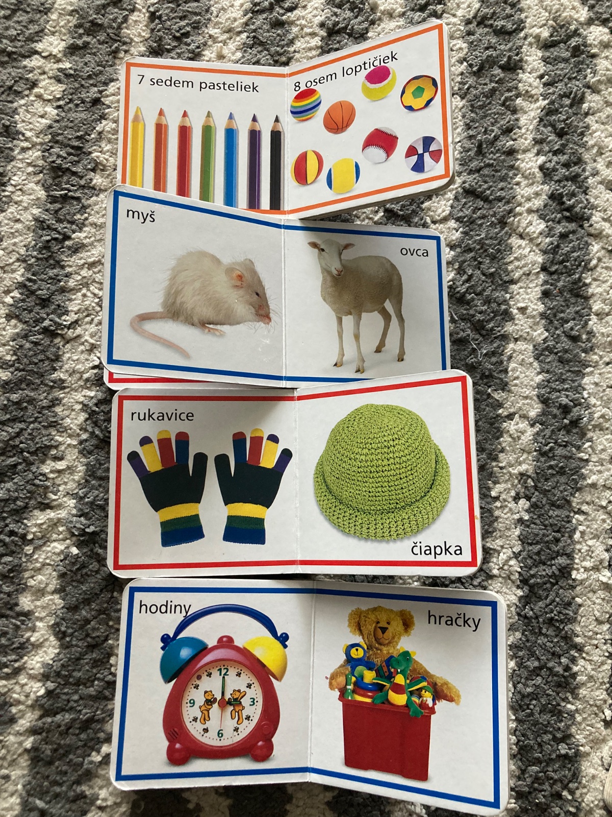 Moju prvú knižnicu tvoria leporelá: Abeceda, Čísla, Hračky, Oblečenie, V dome, Zvieratá.