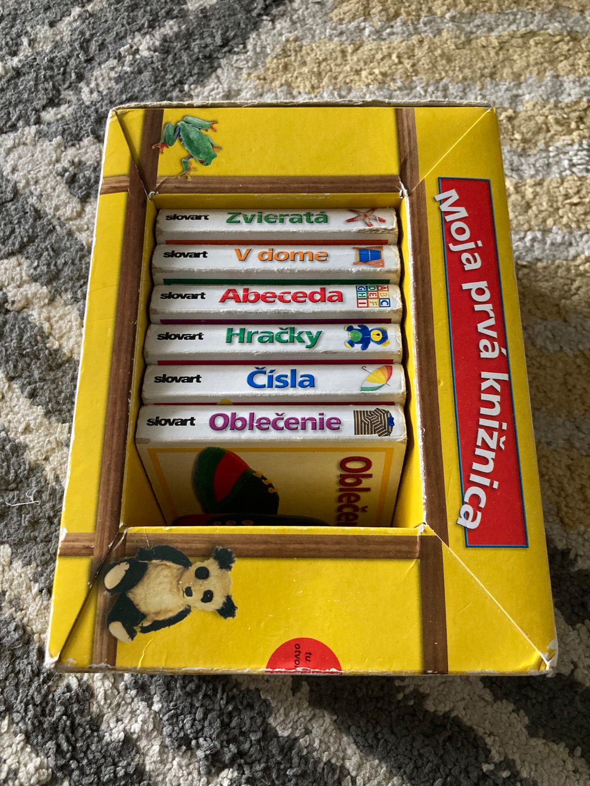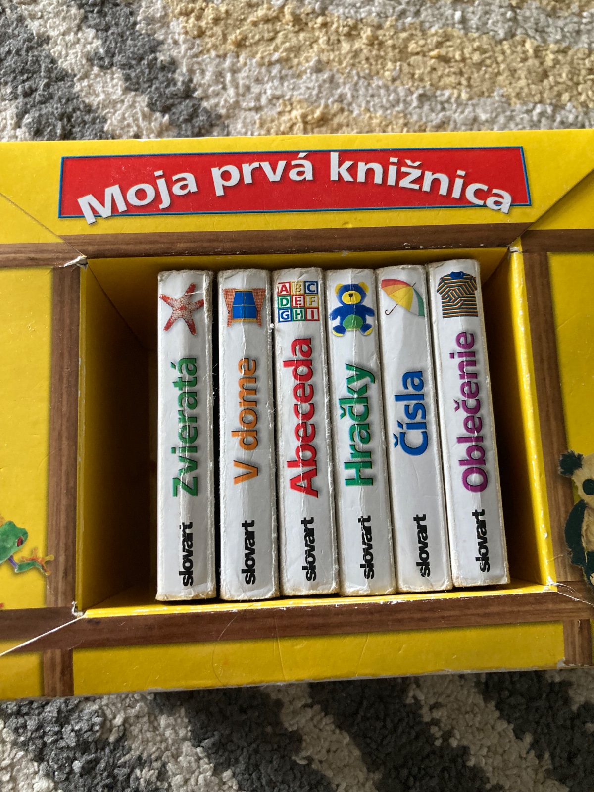 🔹"Moja prvá knižnica" je obľúbená edícia malých leporel (v kufríku) od vydavateľstva Slovart, zameraná na učenie hrou pre najmenších. Obsahuje knižky s témami ako Abeceda, Čísla, Zvieratá či Oblečenie. Tieto knižky rozvíjajú slovnú zásobu a základné poznatky o svete cez veselé ilustrácie.