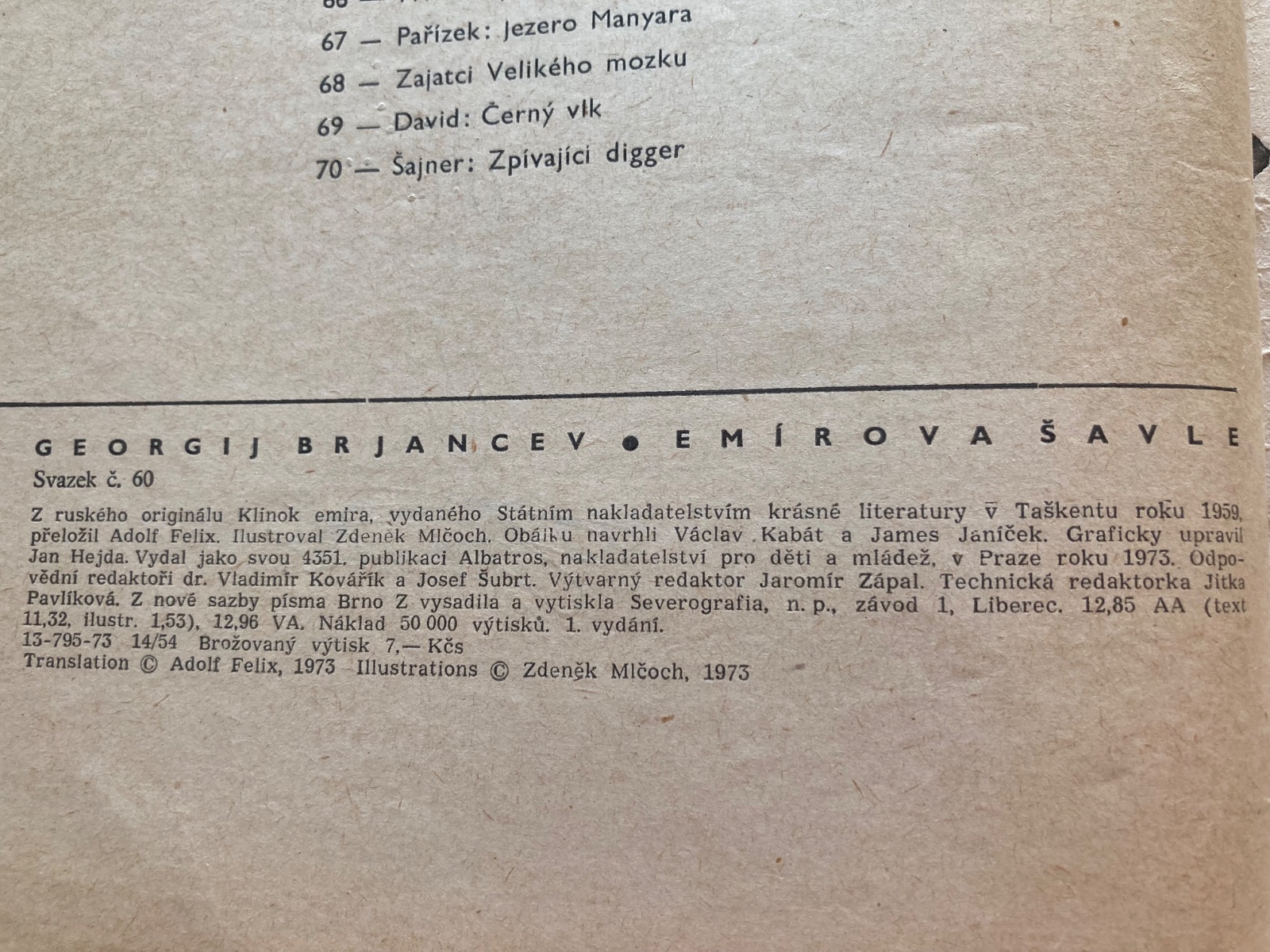 Pekný stav, krásny retro dobrodružný román, prvé vydanie z roku 1973, zachovalý, žltšie strany, bez pečiatok, bez vpisov, chrbát obalu prelepený páskou, obal mierne opotrebovaný, zriedkavý výskyt na trhu