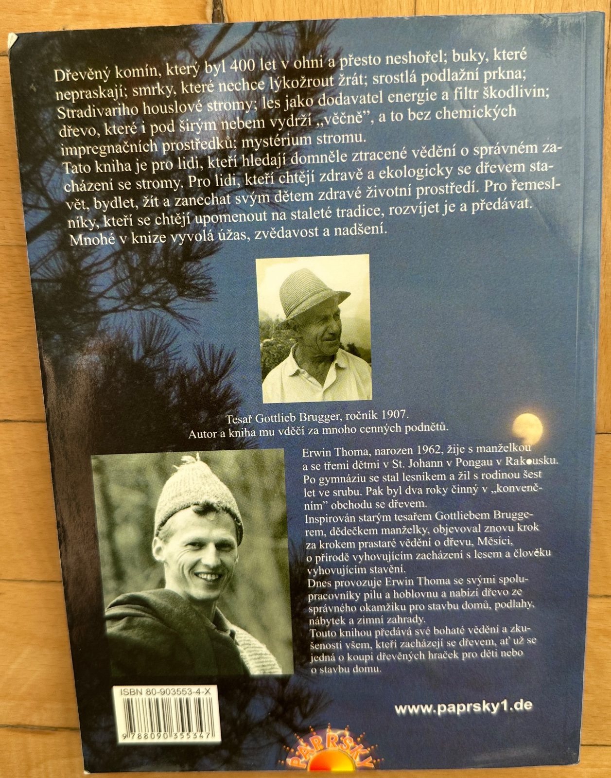 Dřevěný komín, který byl 400 let v ohni a přesto neshořel; buky, které nepraskají; smrky, které nechce lýkožrout žrát; srostlá podlažní prkna; Stradivariho houslové stromy; les jako dodavatel energie a filtr škodlivin; dřevo, které i pod širým nebem vydrží „věčně“, a to bez chemických impregnačních prostředků; mystérium stromu.Tato kniha je pro lidi, kteří hledají domněle ztracené vědění o správné zacházení se stromy. Pro lidi, kteří chtějí zdravě a ekologicky se dřevem stavět, bydlet, žít a zanechat svým dětem zdravé životní prostředí.Pro řemeslníky, kteří se chtějí upomenout na staleté tradice, rozvíjet je a předávat.NAŠE