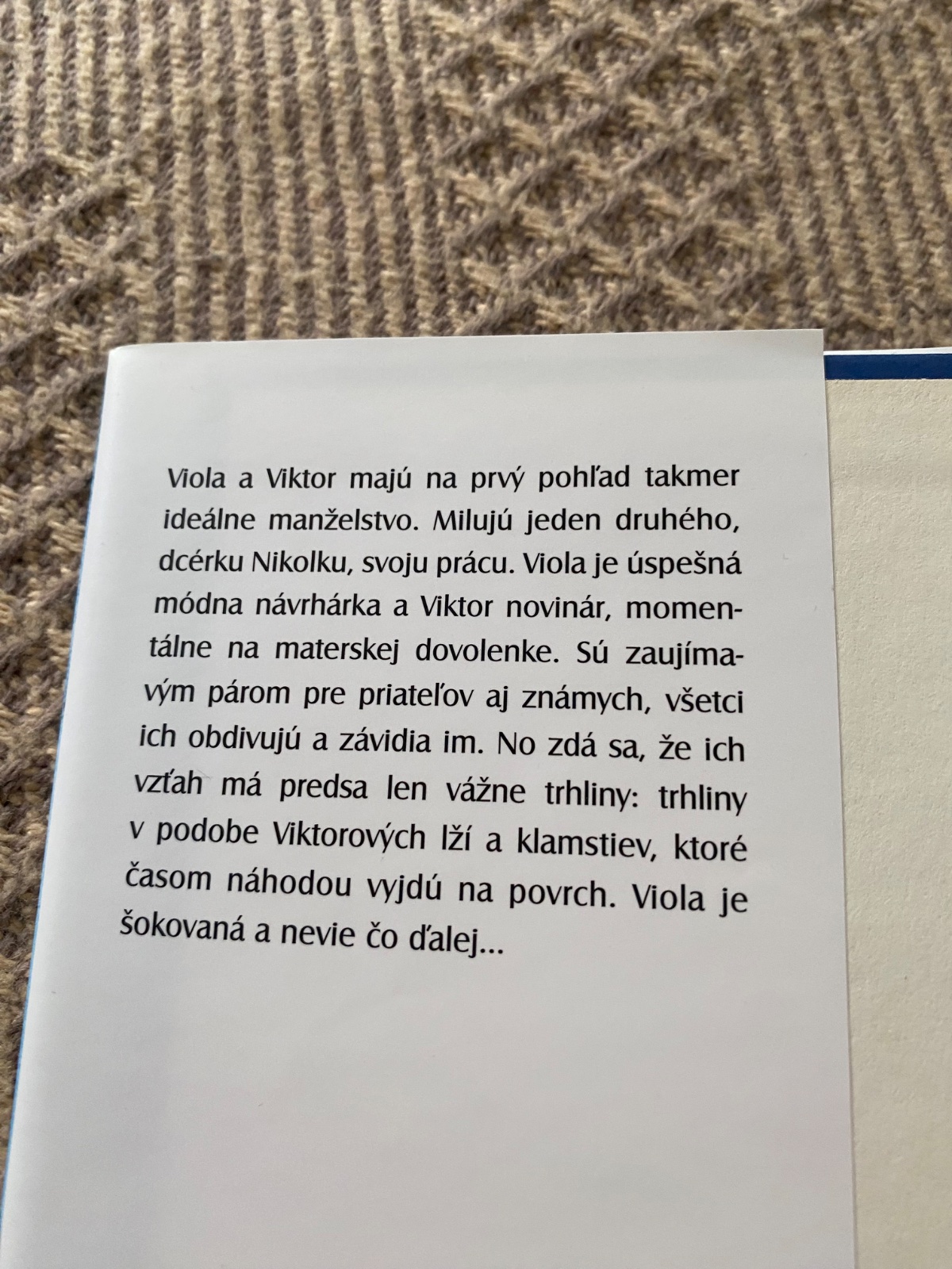 Viola a Viktor majú na prvý pohľad takmer ideálne manželstvo. Milujú jeden druhého, osemmesačnú dcérku Nikolku, svoju prácu. Viola je úspešná módna návrhárka a Viktor novinár, momentálne na materskej dovolenke. Sú zaujímavým párom pre priateľov aj známych, všetci ich obdivujú a závidia im. No zdá sa, že ich vzťah má predsa len vážne trhliny: trhliny v podobe Viktorových lží a klamstiev, ktoré časom náhodou vyjdú na povrch. Viola je šokovaná a nevie čo ďalej...