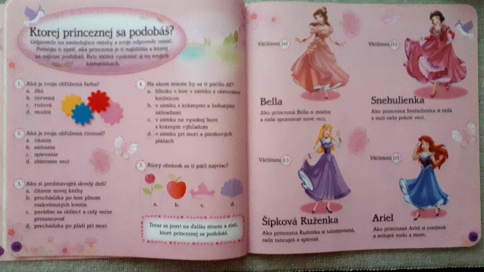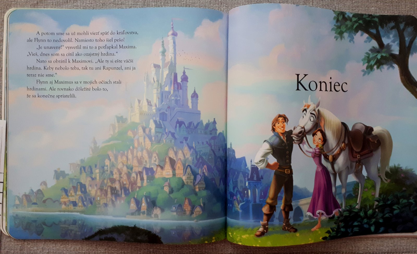 - polovicu knižky tvorí rozprávkový Disney príbeh - Rapunzel, druhá polovica je plná hier a úloh s obľúbenými postavami Disney príbehov