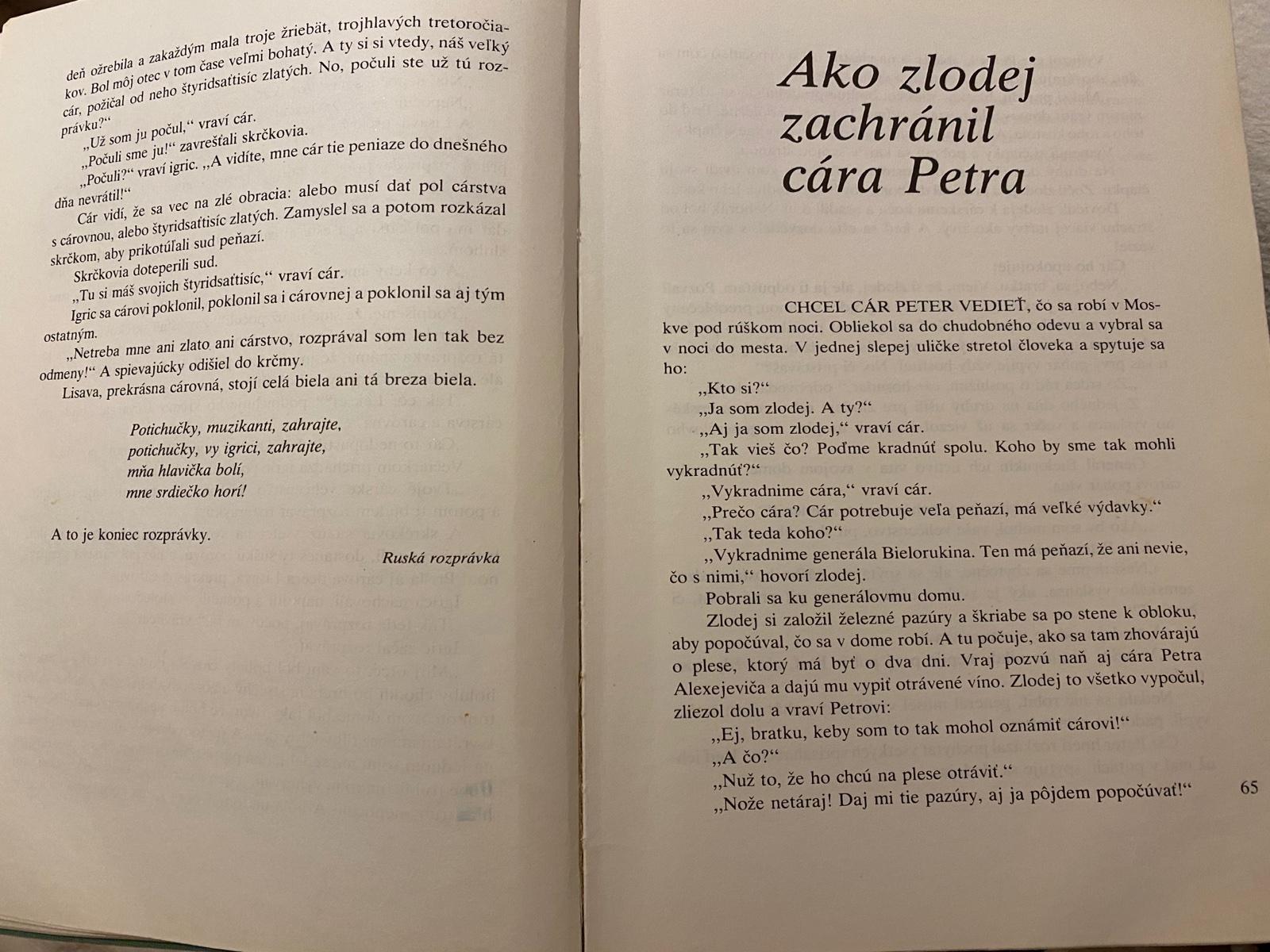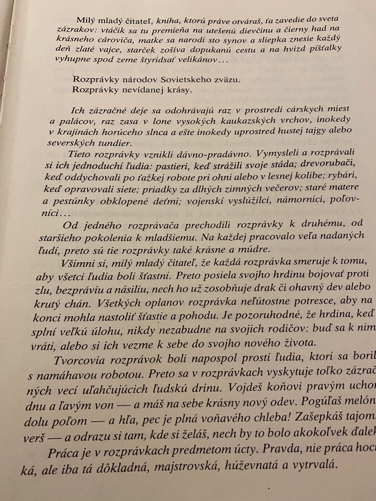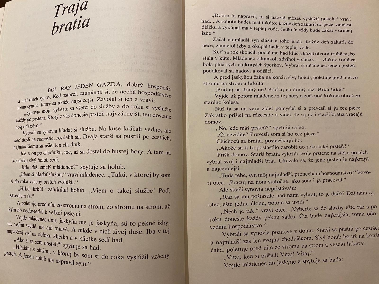 Milý mladý čitateľ, kniha, ktorú práve otváraš, ťa zavedie do sveta zázrakov: vtáčik sa tu premieňa na utešenú dievčinu a čierny had na krásneho cároviča, matke sa narodí sto synov a sliepka znesie každý deň zlaté vajce, starček zošíva dopukanú cestu a na hvizd píšťalky vyhupne spod zeme štyridsať velikánov…