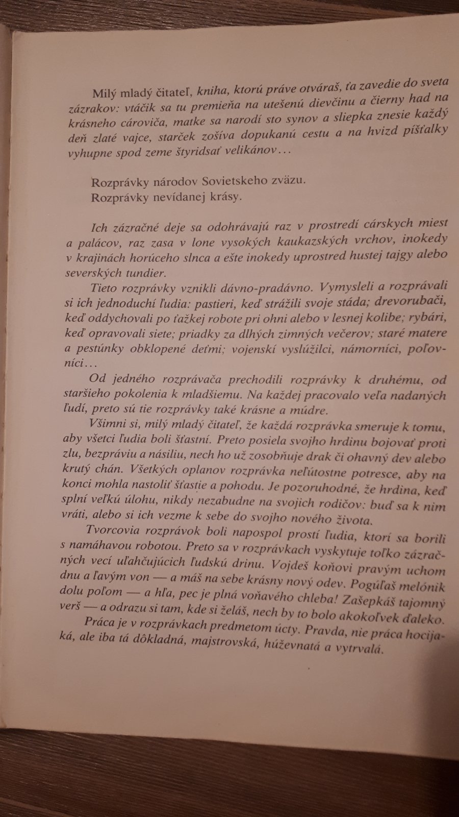 Ich zázračné deje sa odohrávajú raz v prostredí cárskych miest a palácov, raz zasa v lone vysokých kaukazských vrchov, inokedy v krajinách horúceho slnca a ešte inokedy uprostred hustej tajgy alebo severských tundier. Tieto rozprávky vznikli dávno-pradávno, rozprávali si ich jednoduchí ľudia: pastieri, keď strážili svoje stáda; drevorubači po ťažkej práci v lese; rybári, keď opravovali siete; priadky za dlhých zimných večerov….