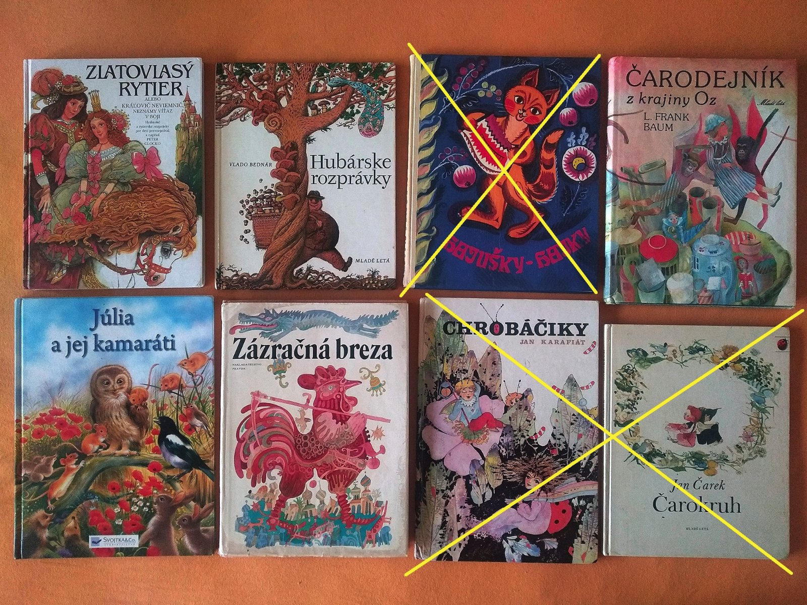 Knižky vo vrchnom rade sú bez poškodení. V spodnom rade knižka Júlia má zvlnité stránky a Zázračná breza má poškodený papierový prebal.