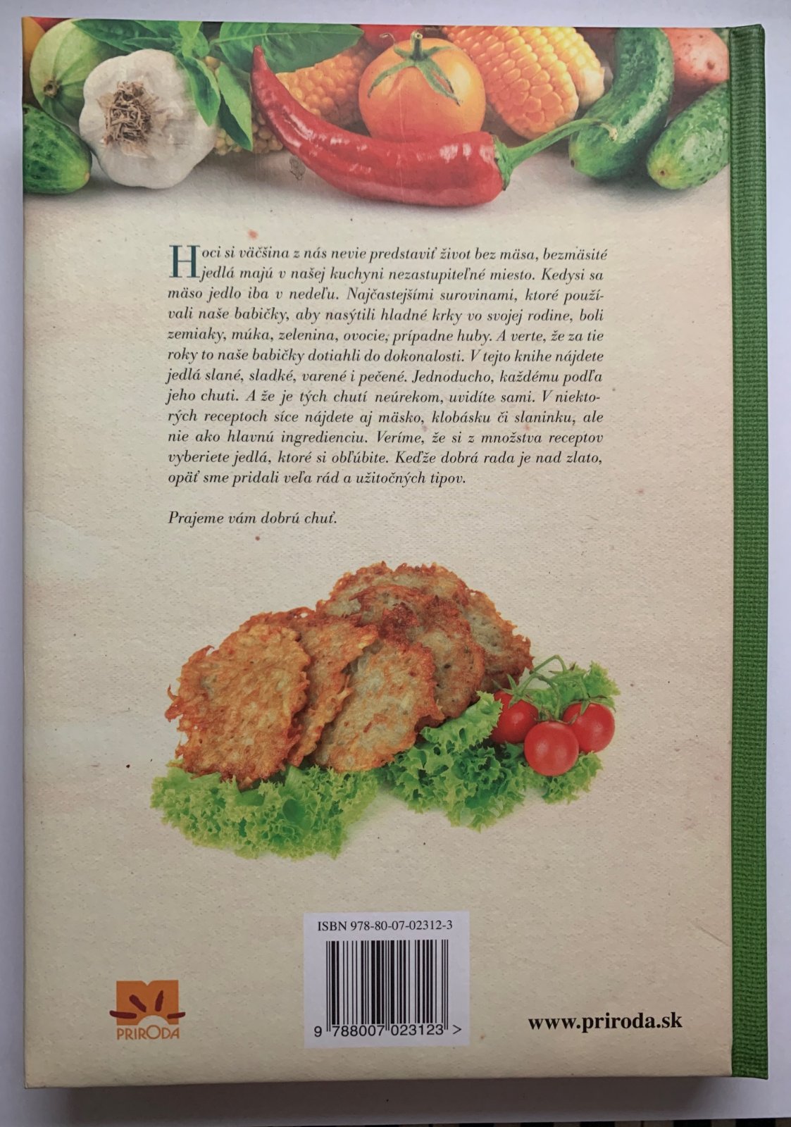 Hoci si väčšina z nás nevie predstavť život bez mäsa, bezmäsité jedlá majú v našej kuchyni nezastupiteľné miesto. Kedysi sa mäso jedlo iba v nedeľu. Najčastejšími surovinami, ktoré používali naše babičky, aby nasýtili hladné krky vo svojej rodine, boli zemiaky, múka, zelenina, ovocie, prípadne huby. A verte, že za tie roky to naše babičky dotiahli do dokonalosti. V tejto knihe nájdete jedlá slané aj sladké, varené i pečené. Jednoducho, každému podľa jeho chuti. A že je tých chutí neúrekom, uvidíte sami. V niektorých receptoch síce nájdete aj mäsko, klobásku či slaninku, ale nie ako hlavnú ingredienciu. Veríme, že si z množstva receptov vyberiete jedlá, ktoré si obľúbite. Keďže dobrá rada je nad zlato, pridali sme opäť veľa rád a užitočných tipov.