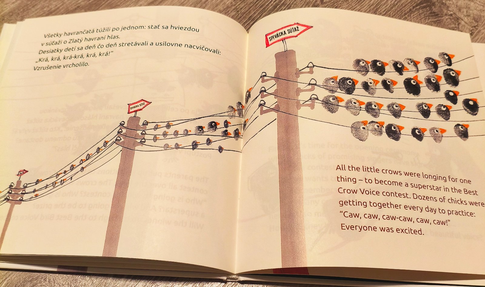 Ide o dvojjazyčnu knihu o malej vranez na jednej strane je po slovensky a na druhej po anglicky. Milá knižka, nenáročný dej a ešte su tam aj tipy kreslenie vtáčikov.