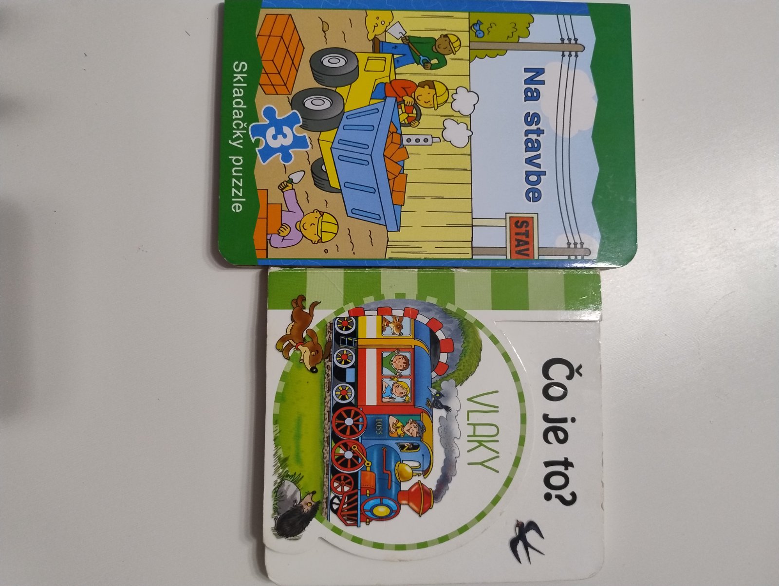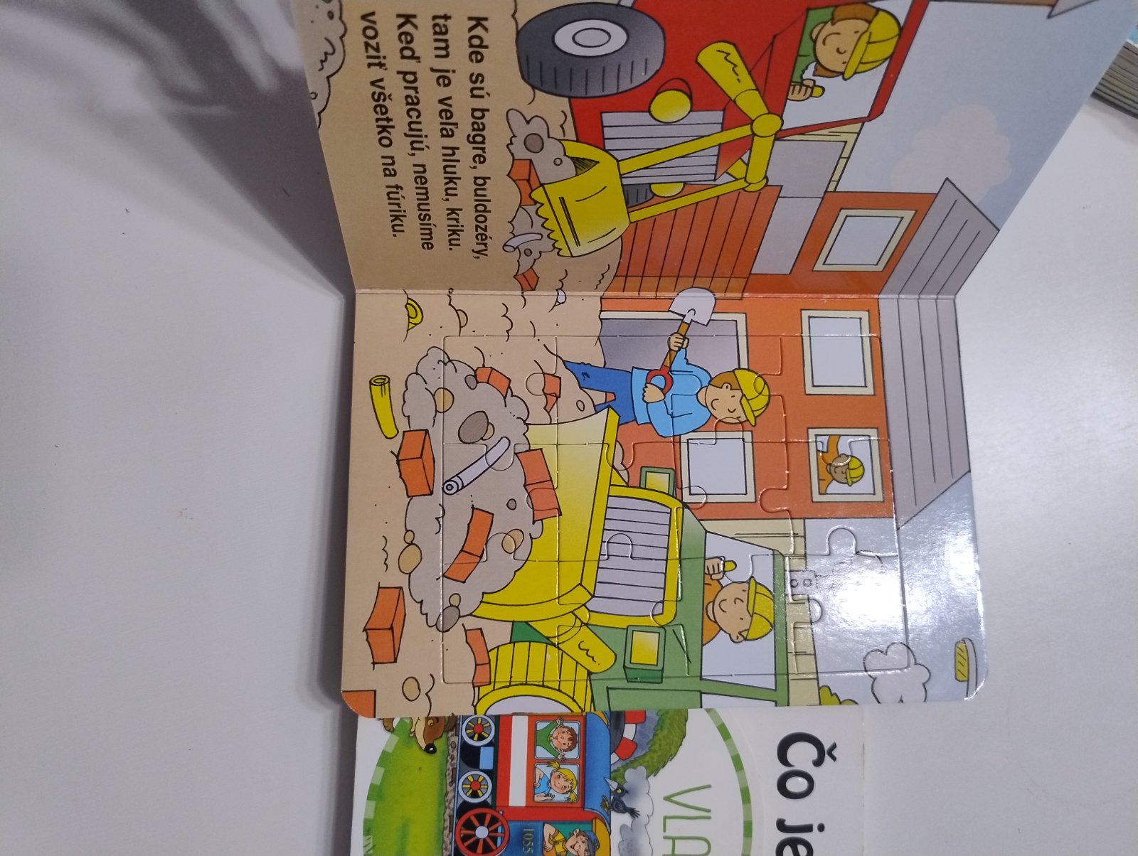 Spolu 2 knihy : Na stavbe s puzzle je úplne nová, pridám k nej knihu Čo je to? Vlaky, bez poškodenia, raz prečítaná, máme 118 detských kníh ;)