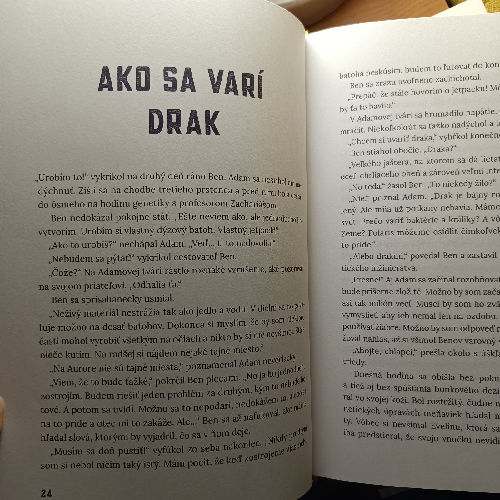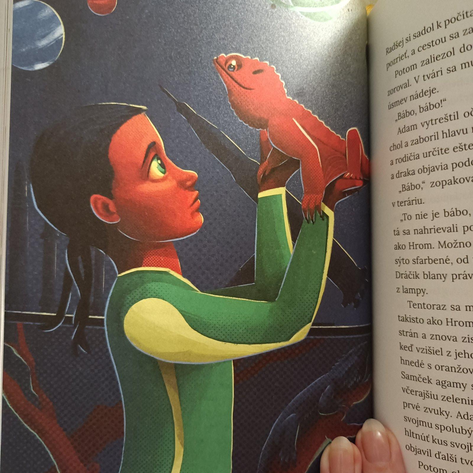 Zaujímavý, prudko čitatelny príbeh...scifi, vesmír, budúcnosť, rodina, kamaráti. Hlavná postava Adam, ktorý žije na vesmírnej stanici a vytvorí si vlastného draka. V knižke je venovanie od autora Samkovi. Jedna stránka je trošku navrhnutá, cena tomu prispôsobená. Obal knihy je fosforovy, v tme svieti.