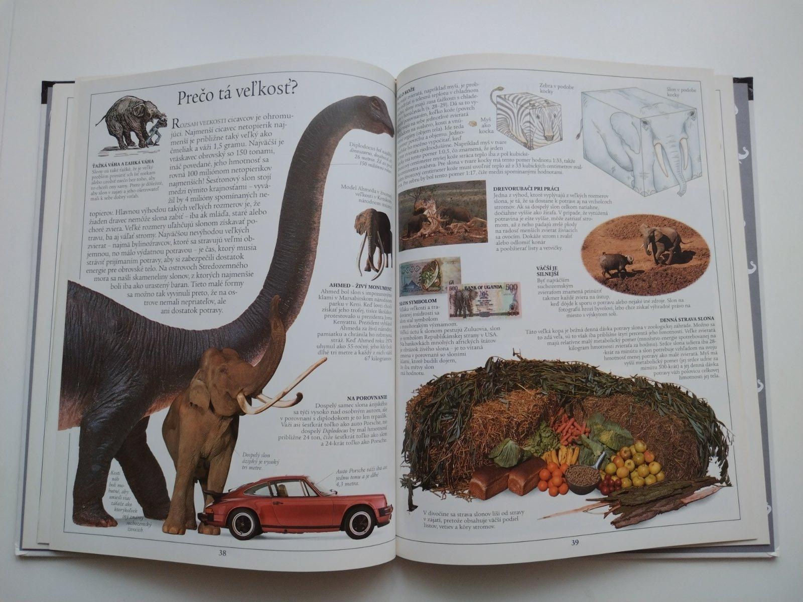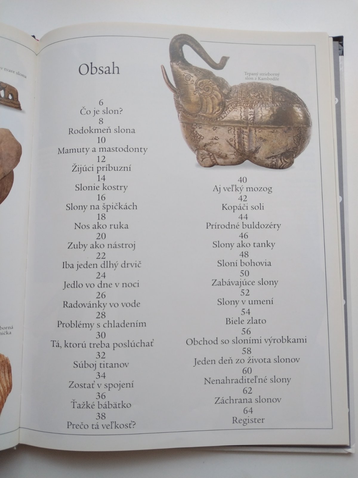 Kniha podrobne dokumentuje život slonov a ich vyhynutých príbuzných, ako boli mamuty. Rozoberá ich anatómiu (chobot, kly), sociálne správanie, inteligenciu a vzťah s ľuďmi v histórii aj súčasnosti.