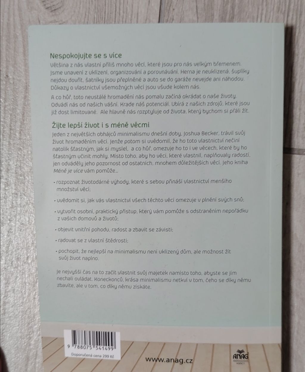 Joshua Becker vám ve své knize Méně je více pomůže najít výhody v minimalistickém způsobu života a uvědomit si, jak vás všechny věci, které vlastníte, odvádí od následování vašich snů. Díky této knize budete schopni si vytvořit osobní a praktický přístup k organizaci domova a života, zažít potěšení ze štědrosti či poznat, proč nejlepším výsledkem úspornosti není čistý dům, nýbrž naplněný život.