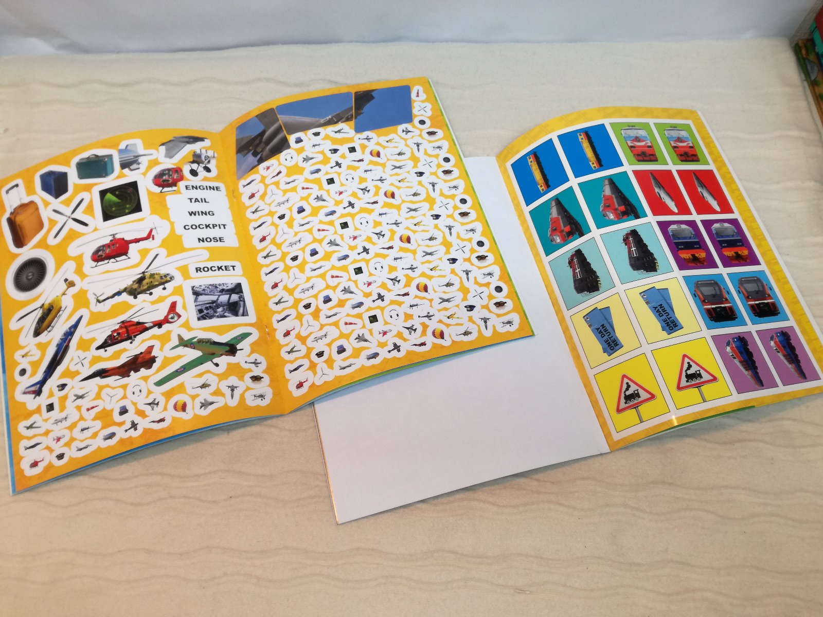 V kazdej je pexeso / dve stranky nalepiek / malovanky, hra na posob snakes & ladders s tokenmi.