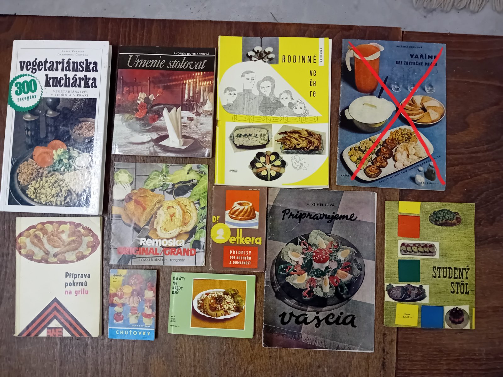 - 3. fotka: Vegetariánska kuchárka, mierne špinavý obal aj úvodná dvojstránka: 2 €, Umenie stolovať: 2 €, Šaláty na každý deň: 1 €, ostatné publikácie: po 2 € za kus