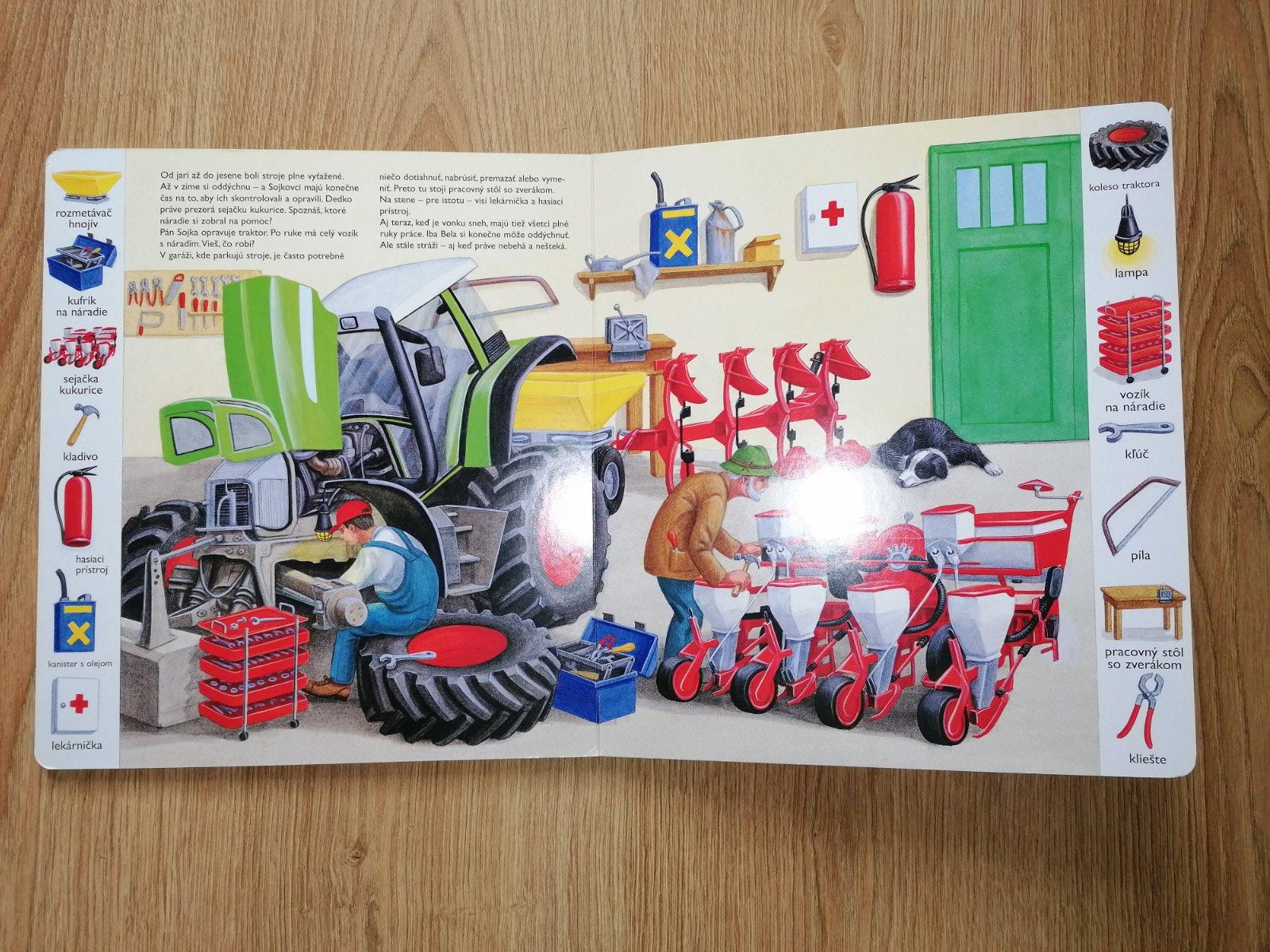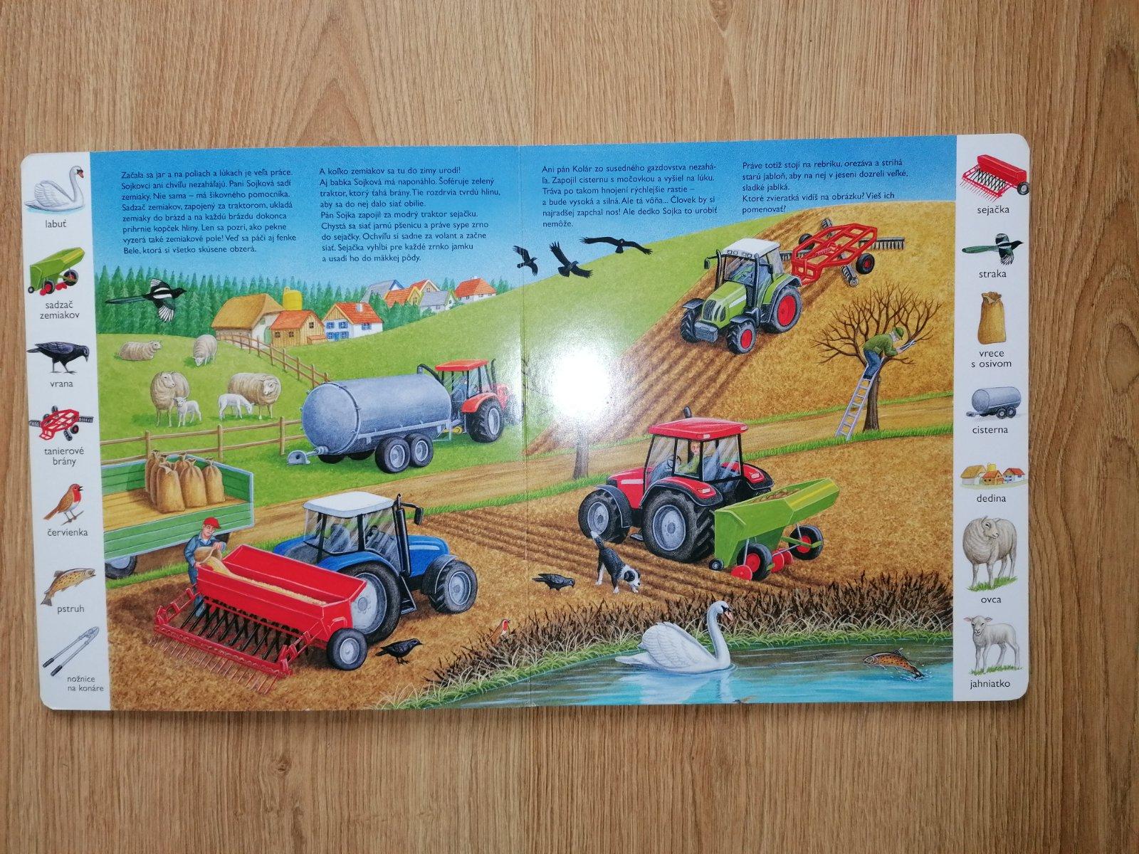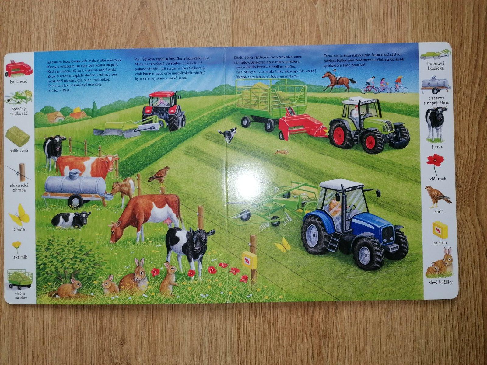 Prekrásna obrázková knižka s príbehom rodiny Sojkových, z bočnej lišty dieťatko vyhľadá rovnaký obrázok na ilustrácií v strede, pomenúva zvieratká, rastliny, stroje, oboznamuje sa s farmu, prírodou