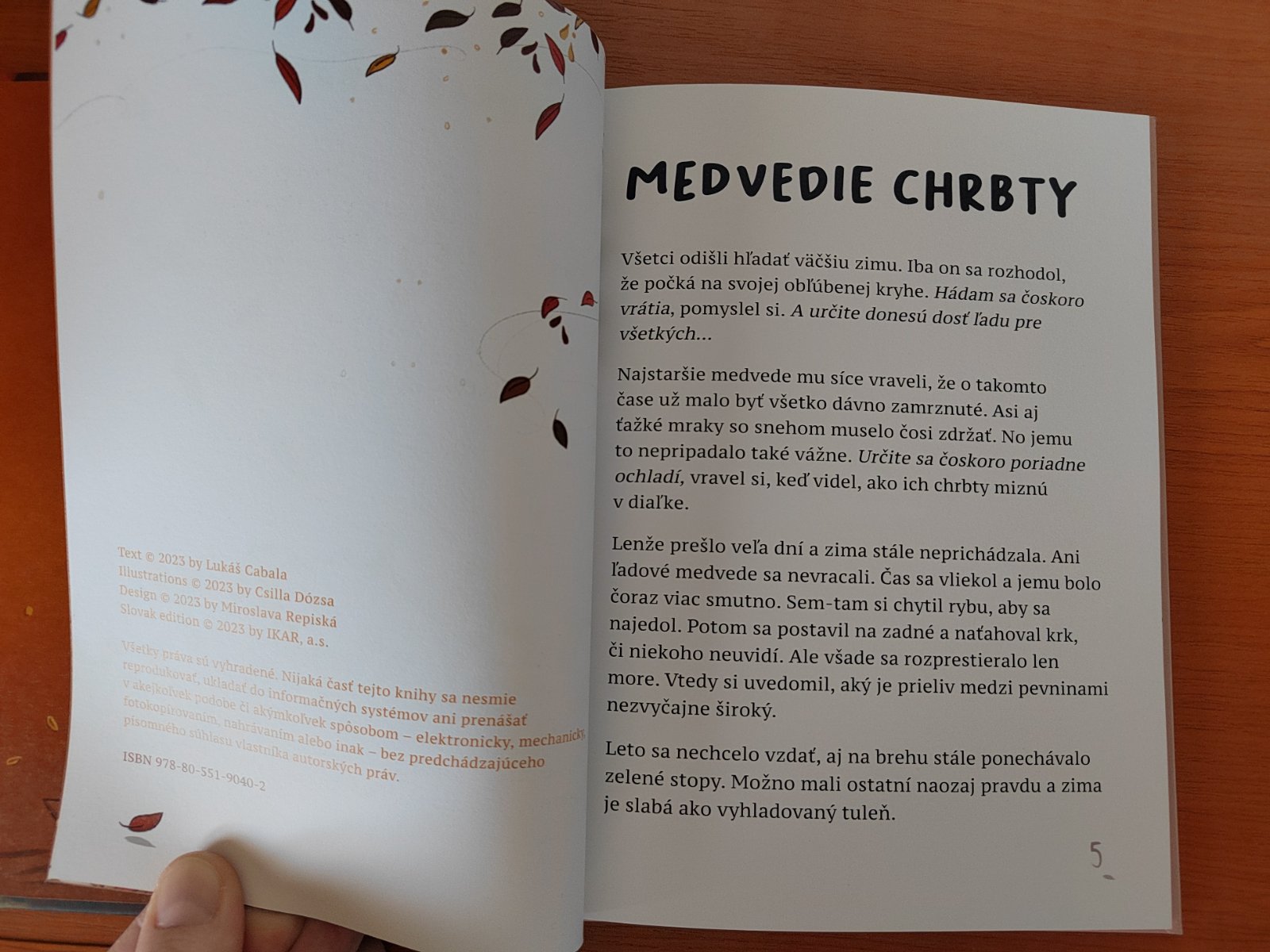 Citlivé rozprávanie pre menších či väčších čitateľov o krehkom pute medzi človekom a zvieraťom je poetickým svedectvom o meniacej sa prírode a o odvahe prekonávať prekážky na ceste do neznáma.